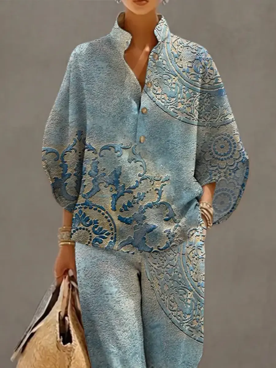 Women's Retro Floral Art Print Casual 3/4 Sleeve Top And Pants Cotton Linen Suits