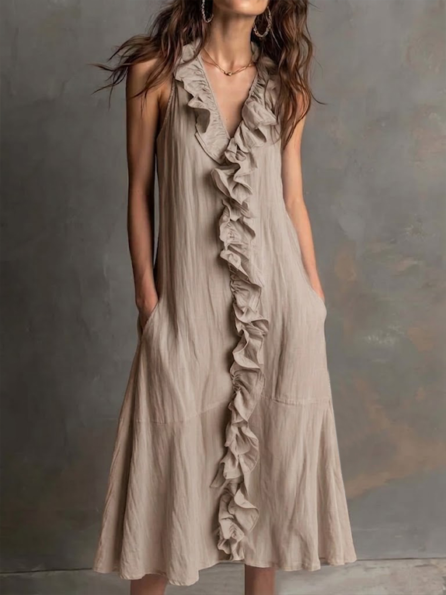 Elegant Ruff Collar Fashion Linen Cotton Midi Dress