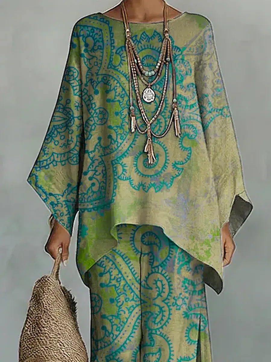 Women's Vintage Floral Art Comfortable Loose Cotton Linen Wide-leg Pants Two-piece Set