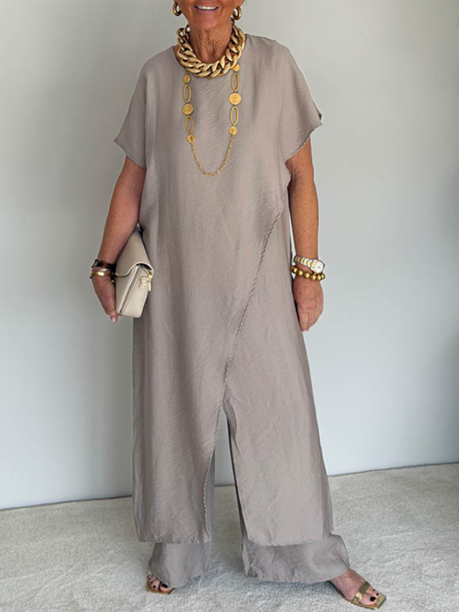 Women's Round Neck Long Sleeve Wide-leg Casual Irregular Hem Two-piece Pants Set