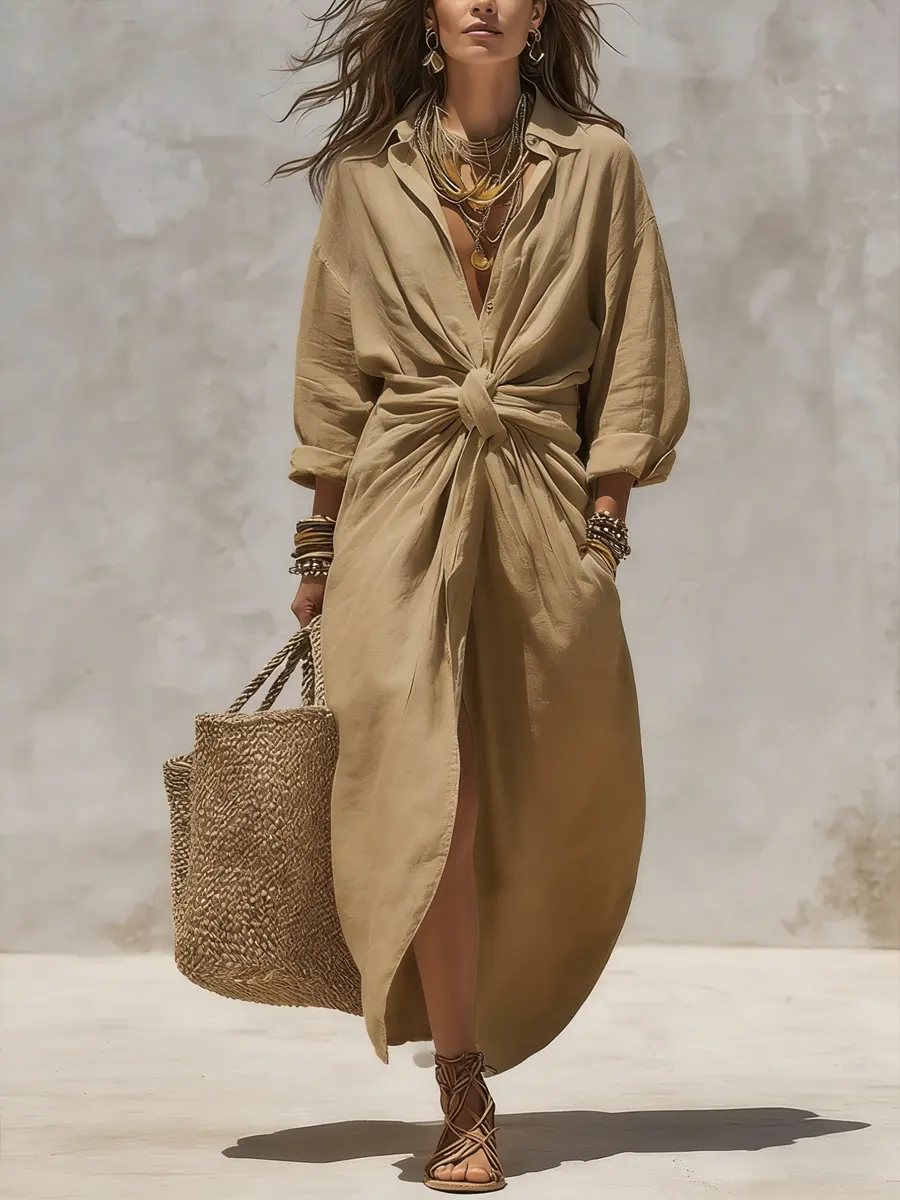 Cozy Shirt Collar Solid-color Linen-cotton Dress