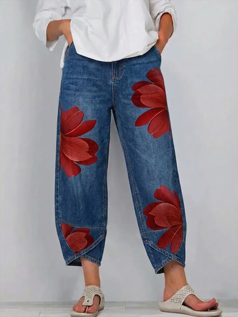 Women's Hippie Style Pattern Art Print Casual Cotton Denim Pants