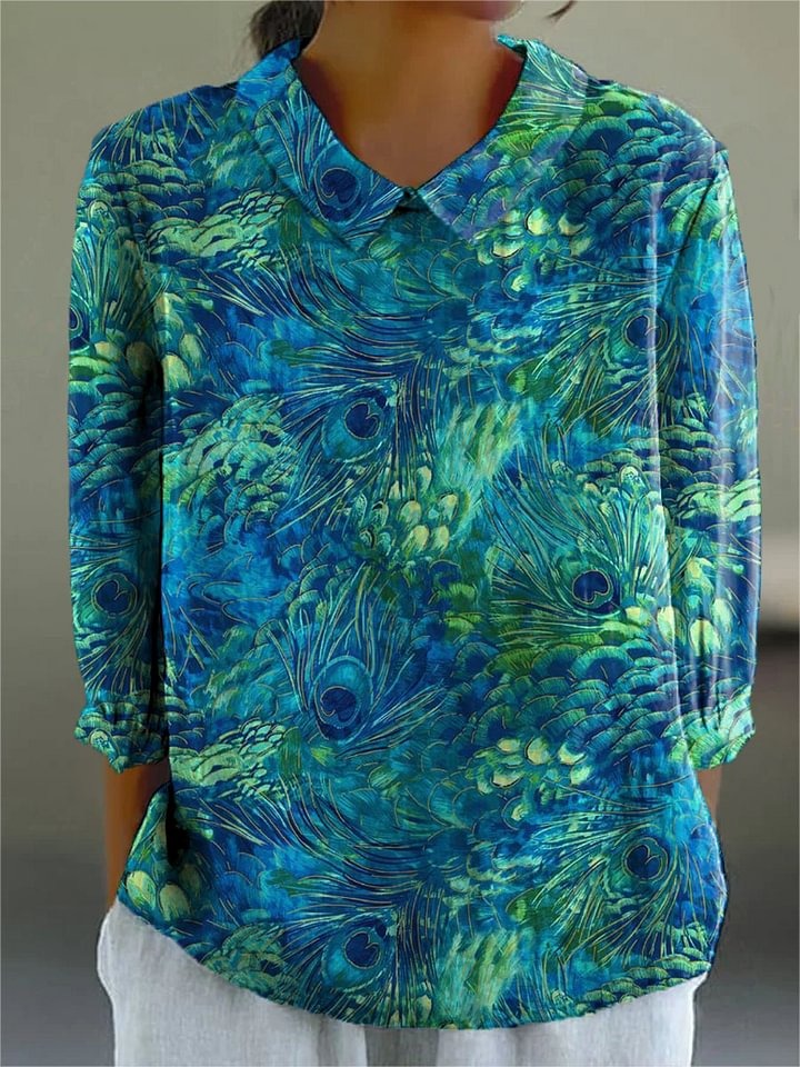 Women's Peacock Feather Pattern Art Print Casual Cotton Linen V-neck Shirt