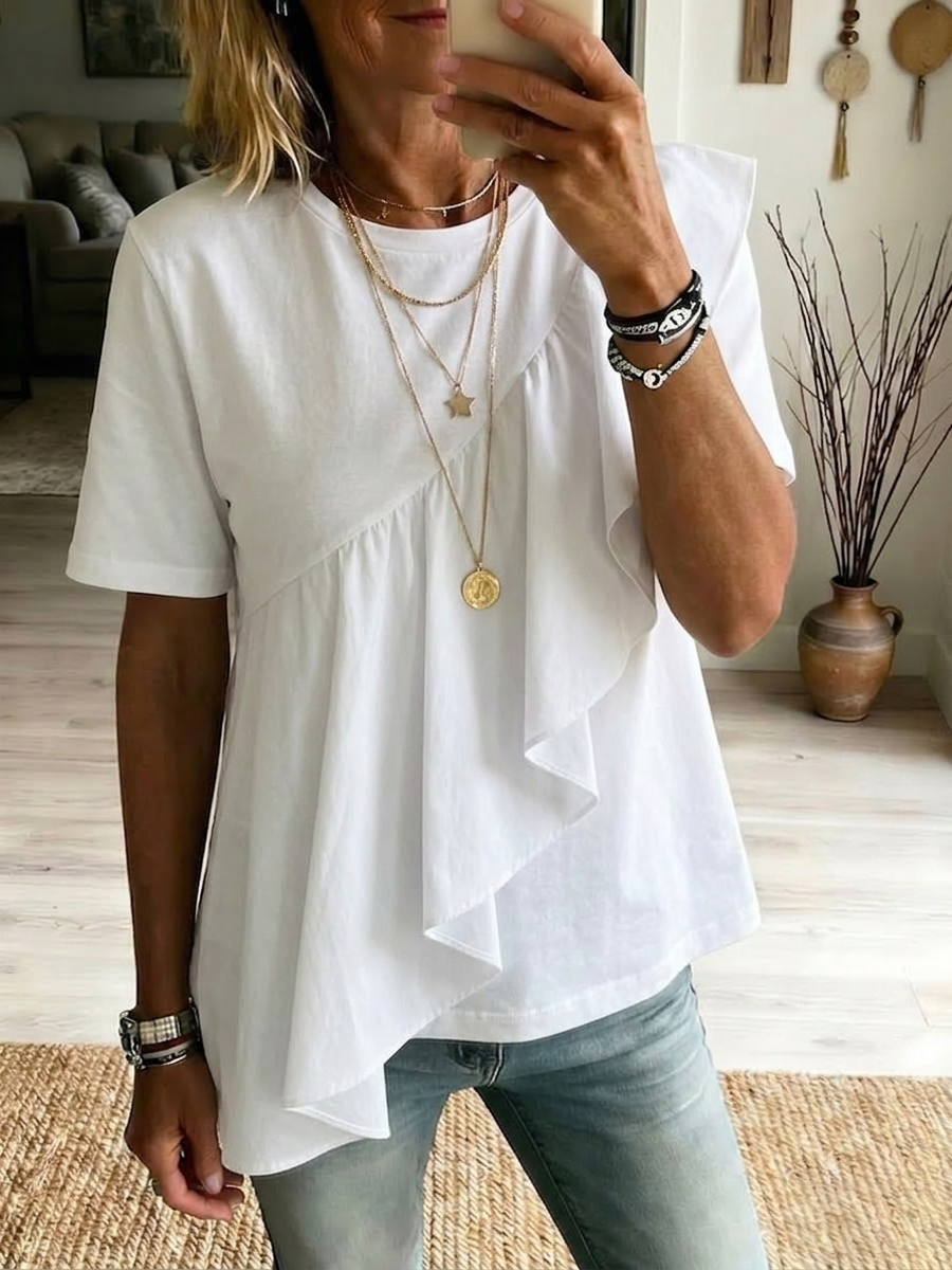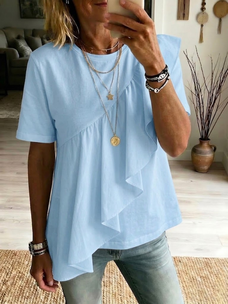 Women's Elegant Solid Color Ruffled Collar Button 100% Cotton Short-sleeved T-shirt