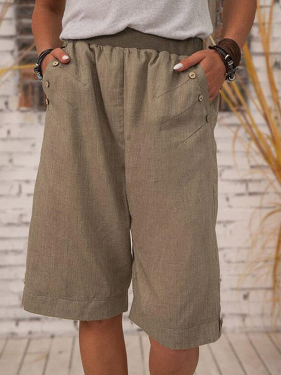 Women's Solid Color Elastic Waist Loose Casual Pockets Cotton and Linen Straight-leg Shorts