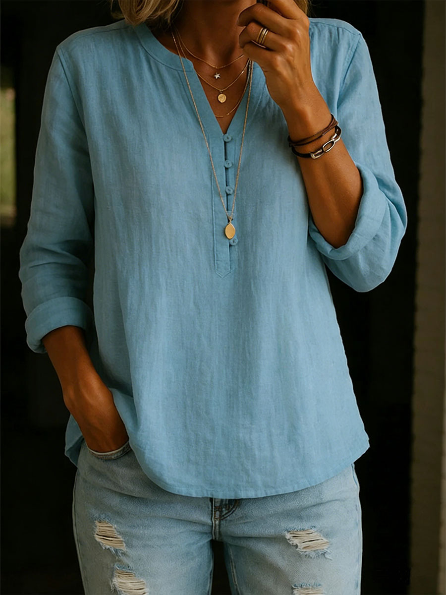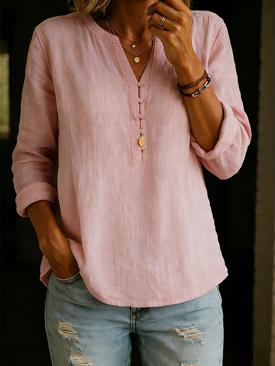 Women's Solid Color V-neck Long-sleeved Casual Loose Cotton And Linen Top