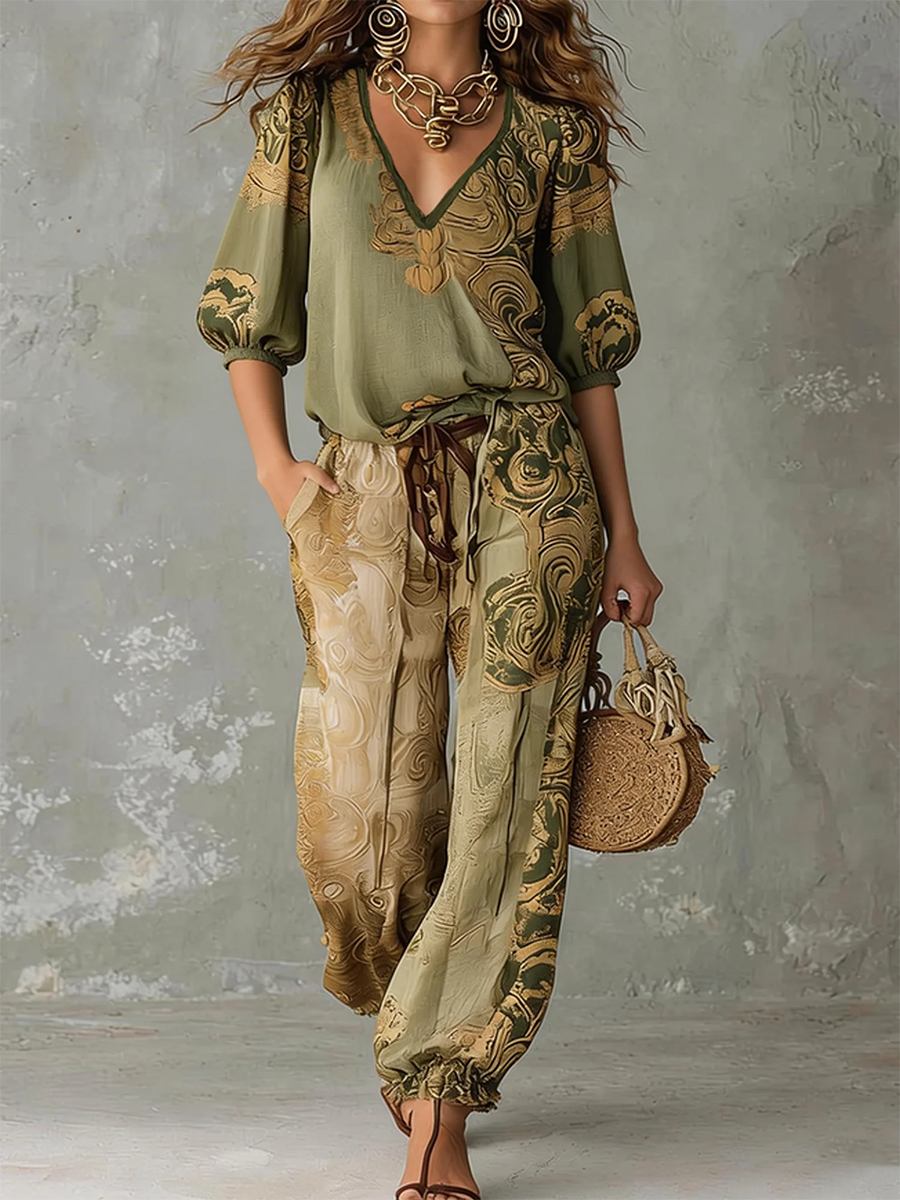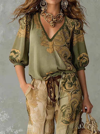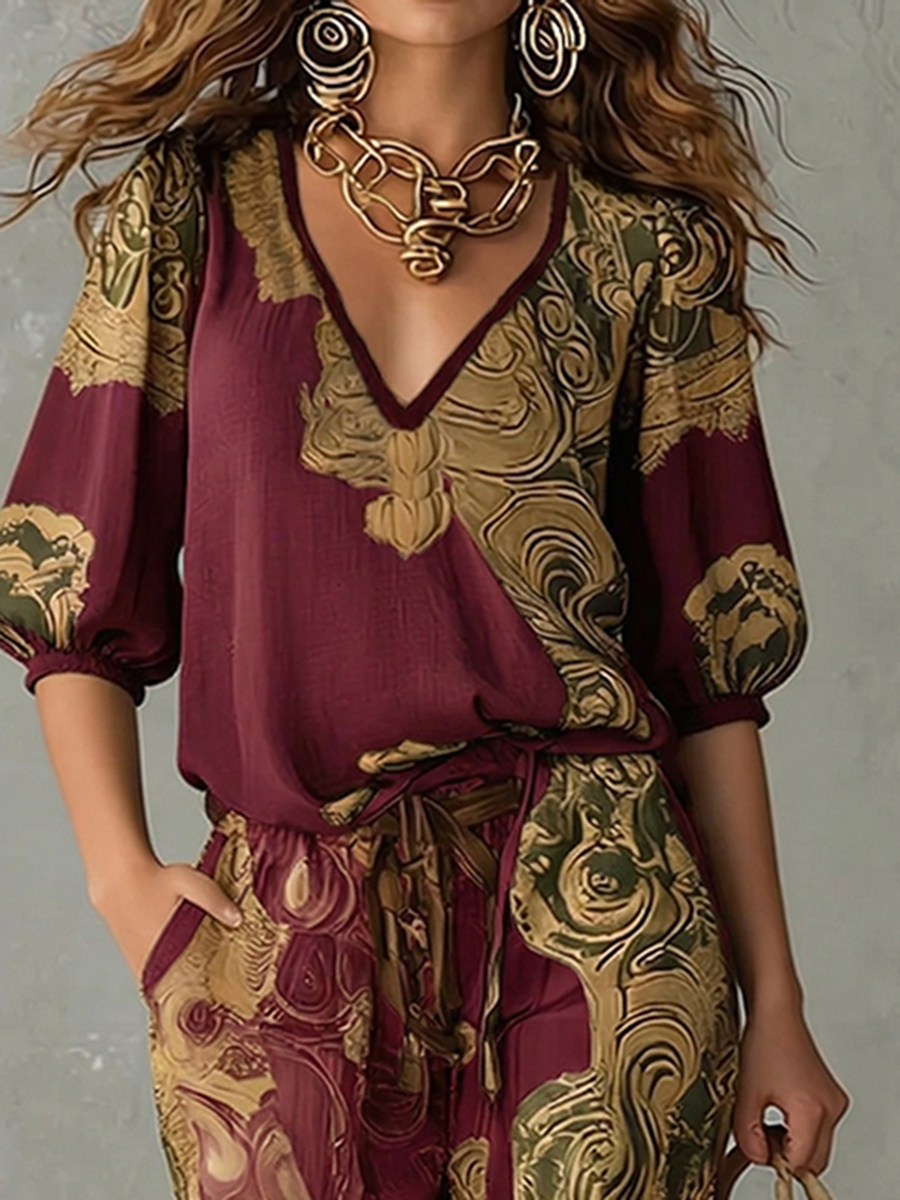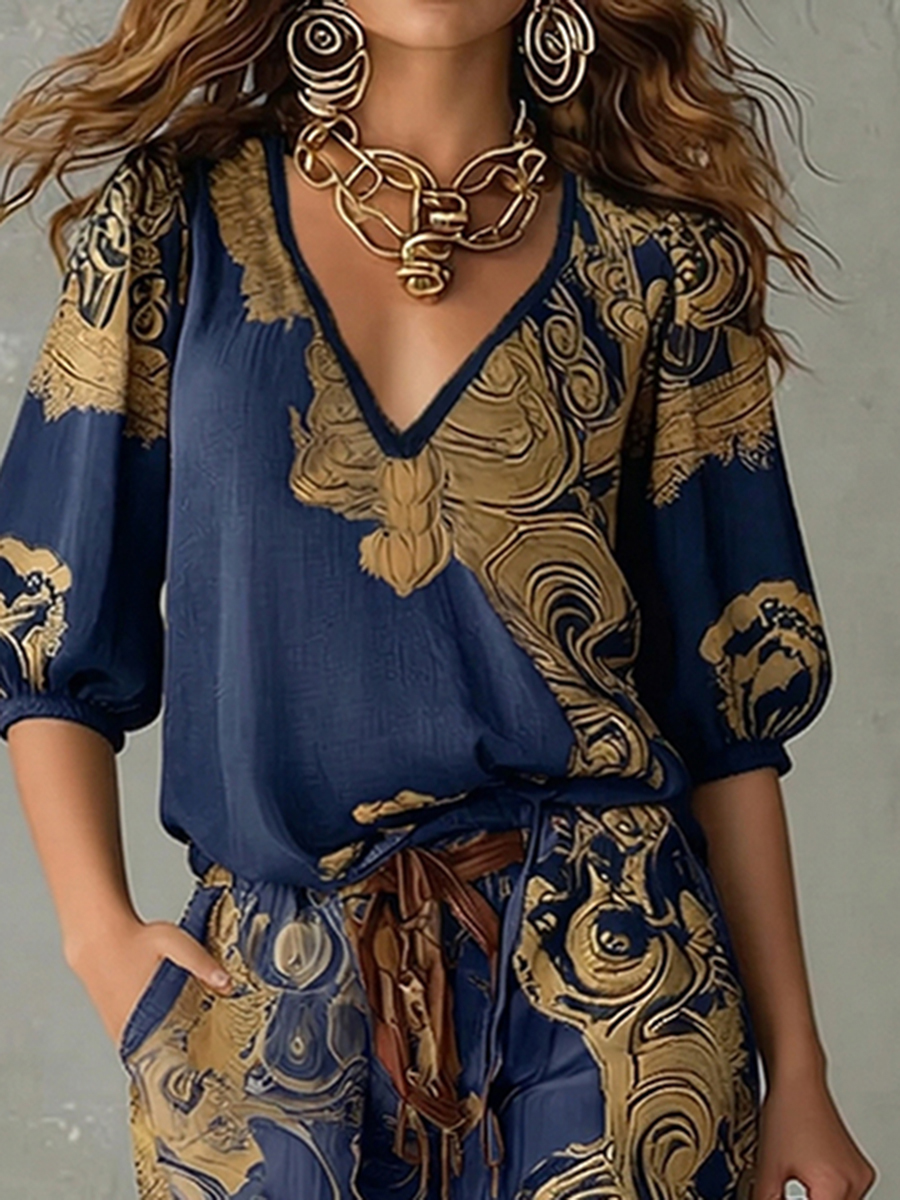 Bohemian Retro Vacation-style Printed V-neck Shirt