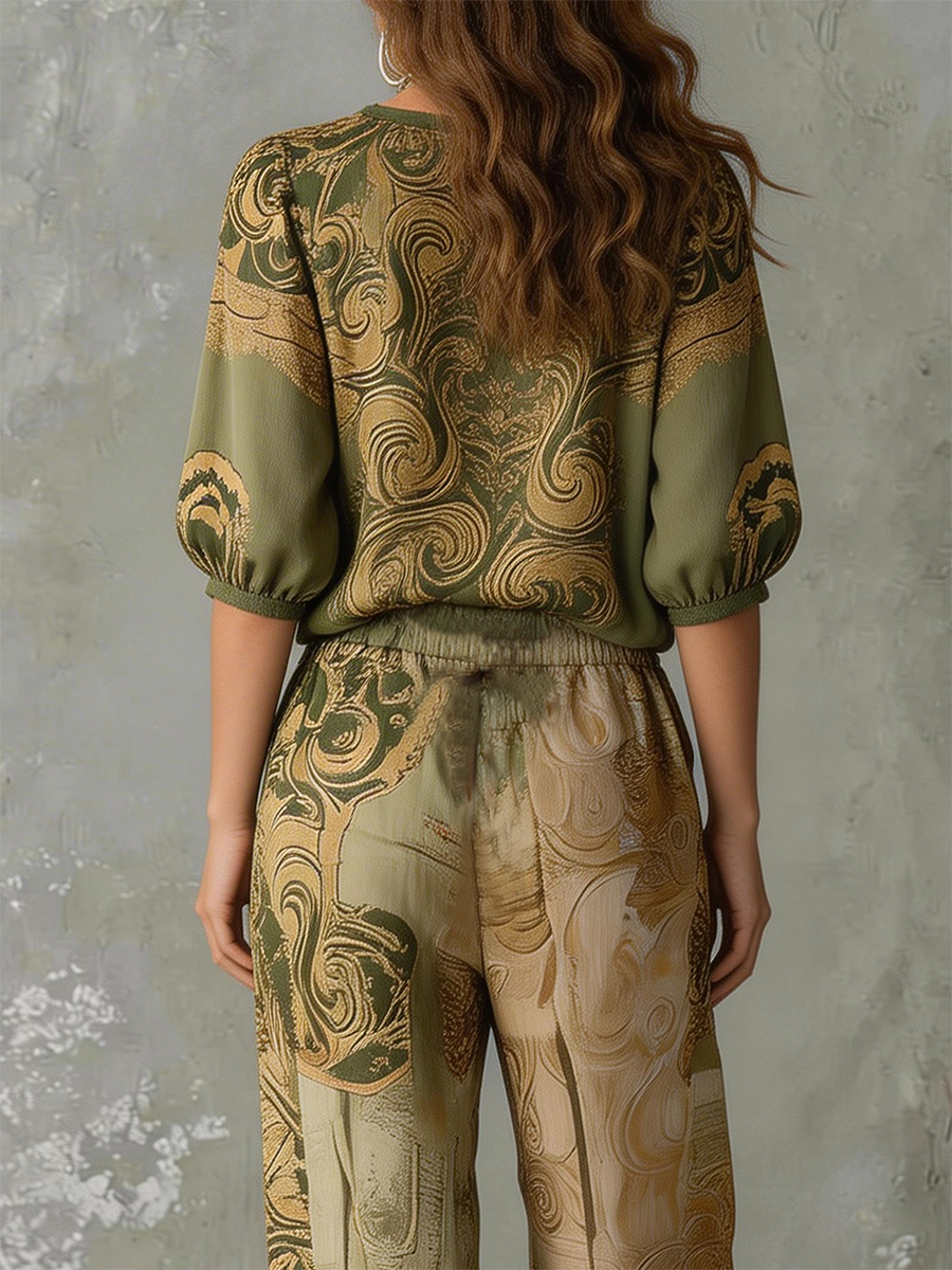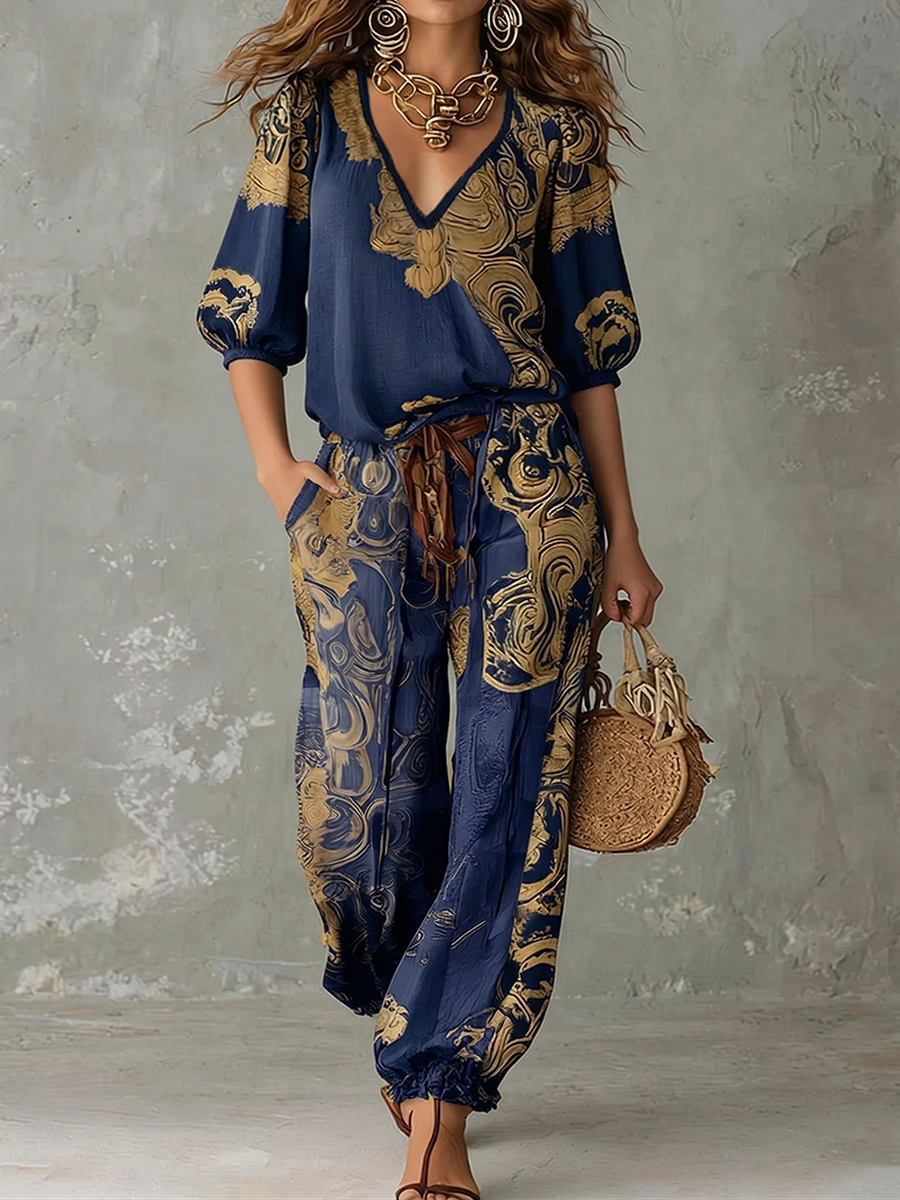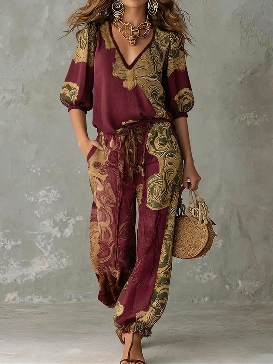 Bohemian Retro Vacation-style Printed V-neck Shirt