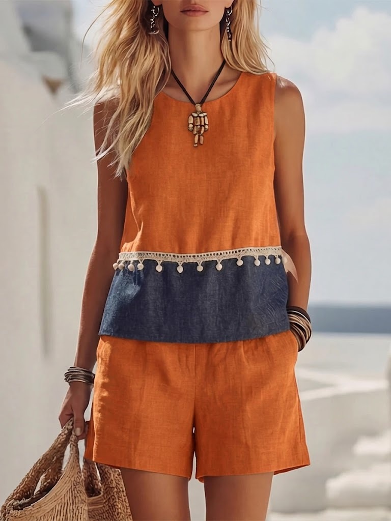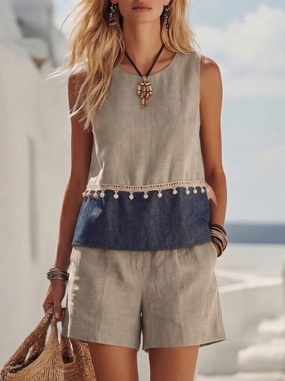 Bohemian-style Patchwork Linen And Cotton Top And Shorts Two-piece Set