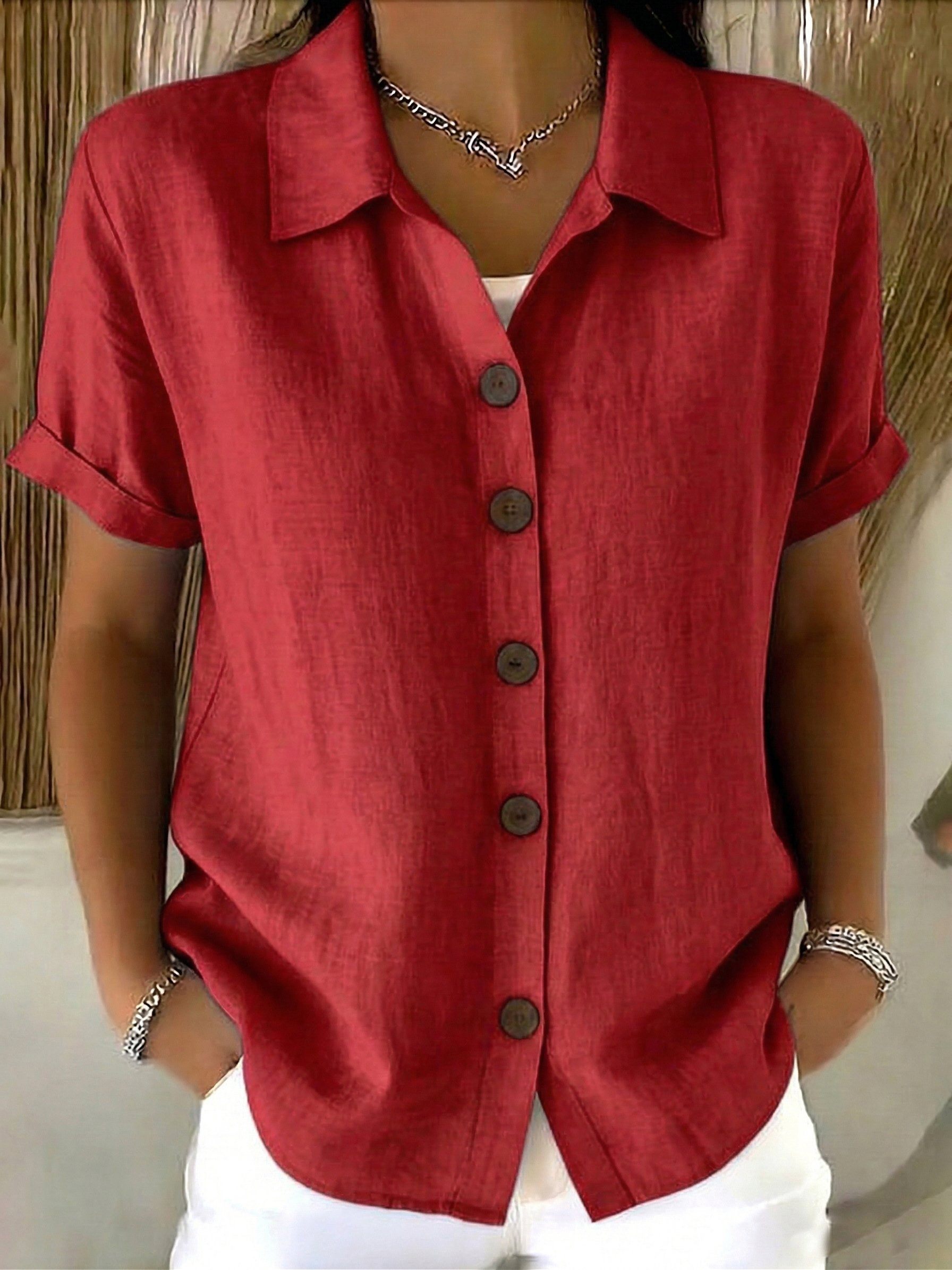Casual Cozy Basic Button-up Linen-cotton Short-sleeved Shirt