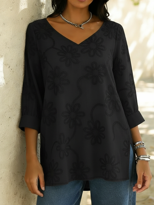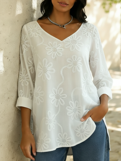 Casual Loose-fitting Floral Embroidery Cotton Shirt Blouse
