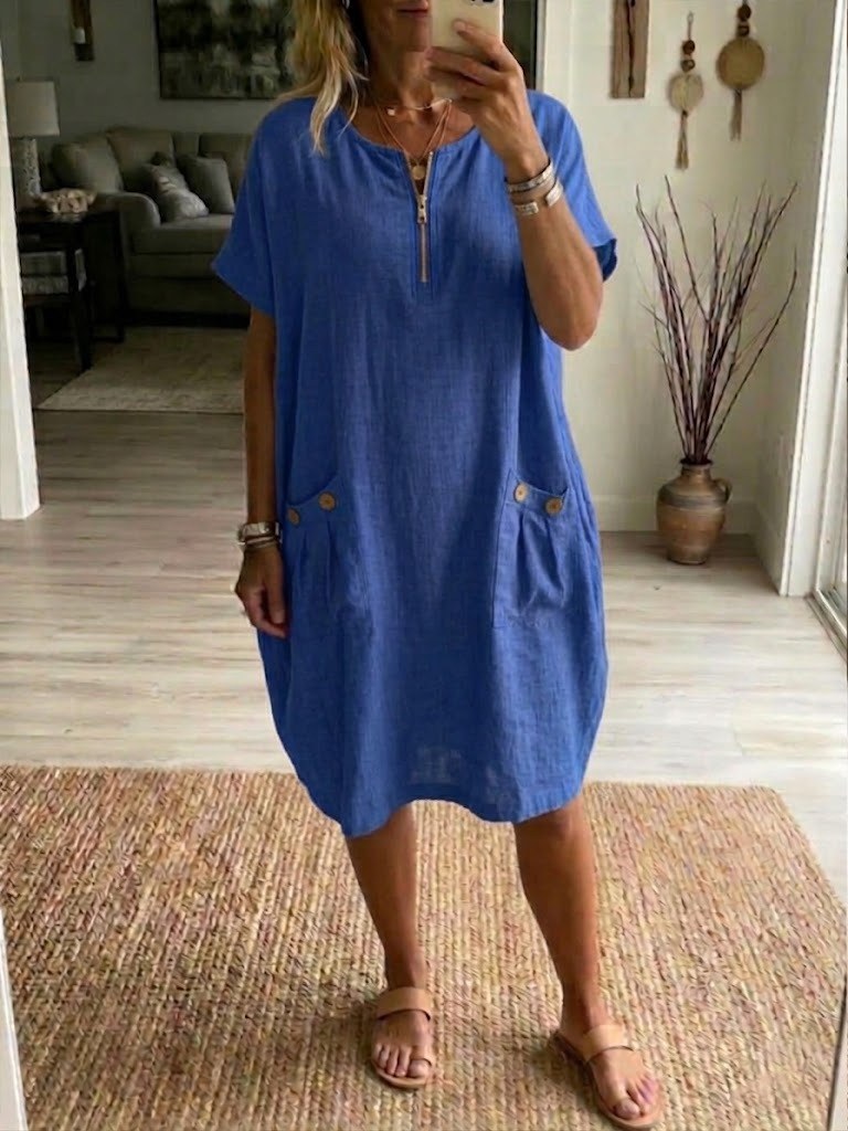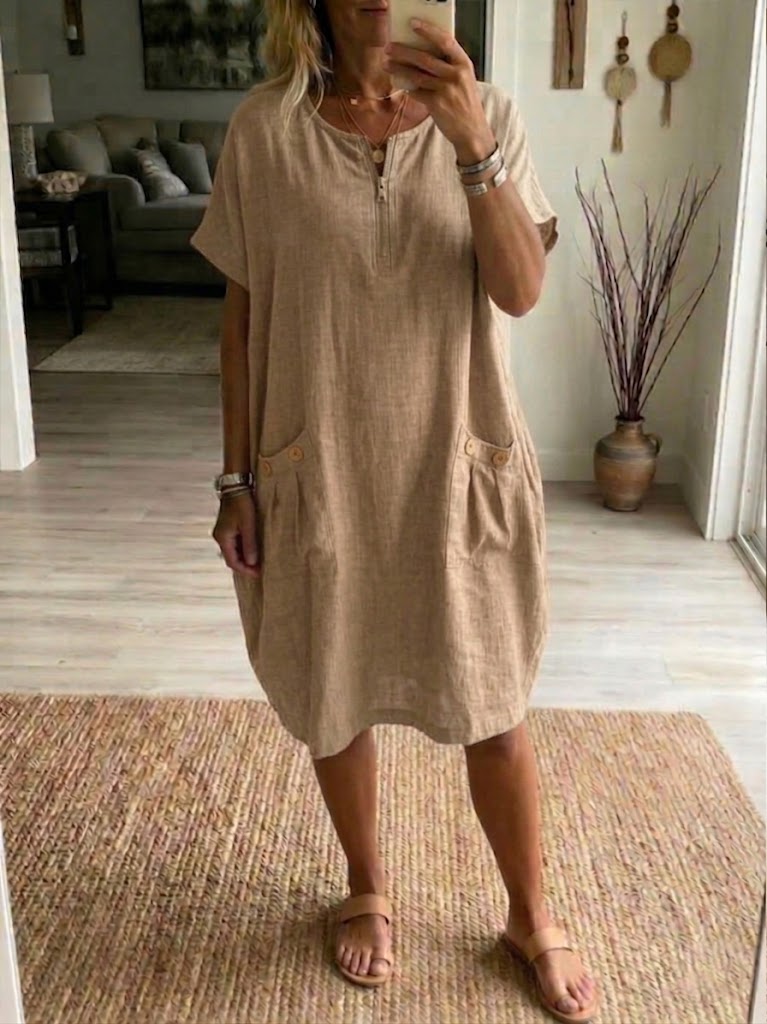 Casual Loose Half-zip Linen And Cotton Dress