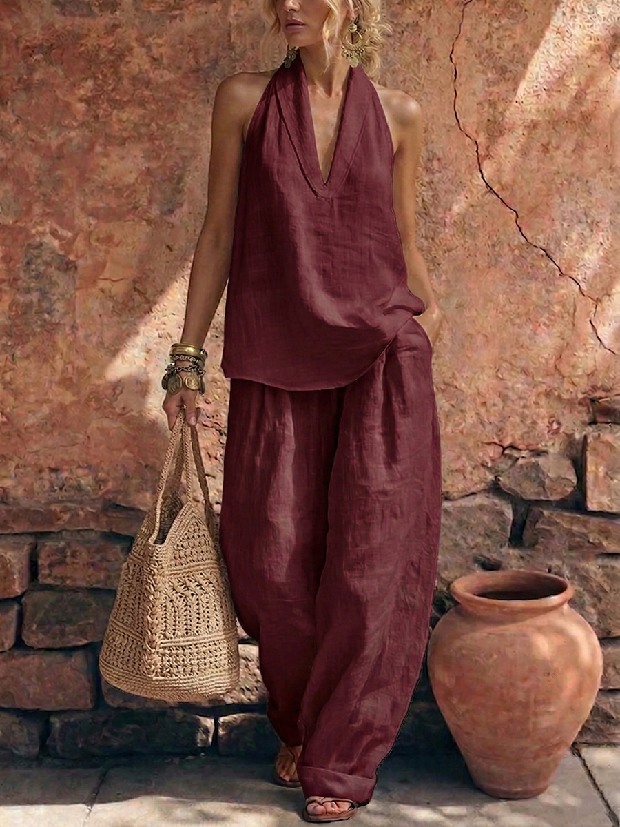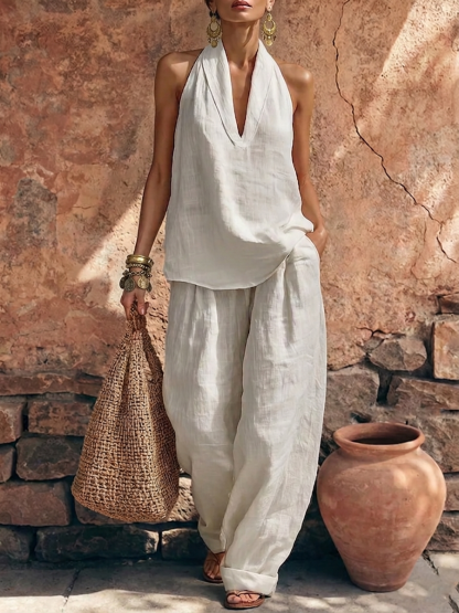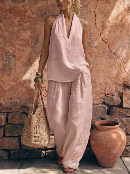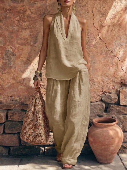 This simple cotton-linen set features a stylish and elegant collar that is both comfortable and stylish.
