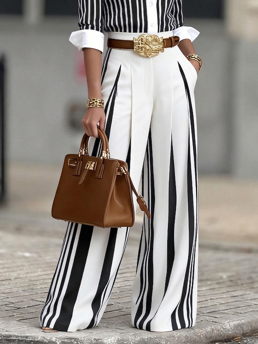 Elongating Vertical Stripes: A chic, art-inspired striped pattern designed to visually lengthen your legs and add a professional edge.