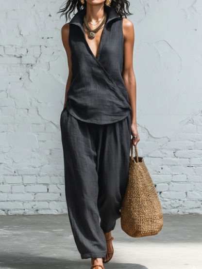 Minimalist Collared Shirt And Wide-leg Pant Linen Two-piece Set