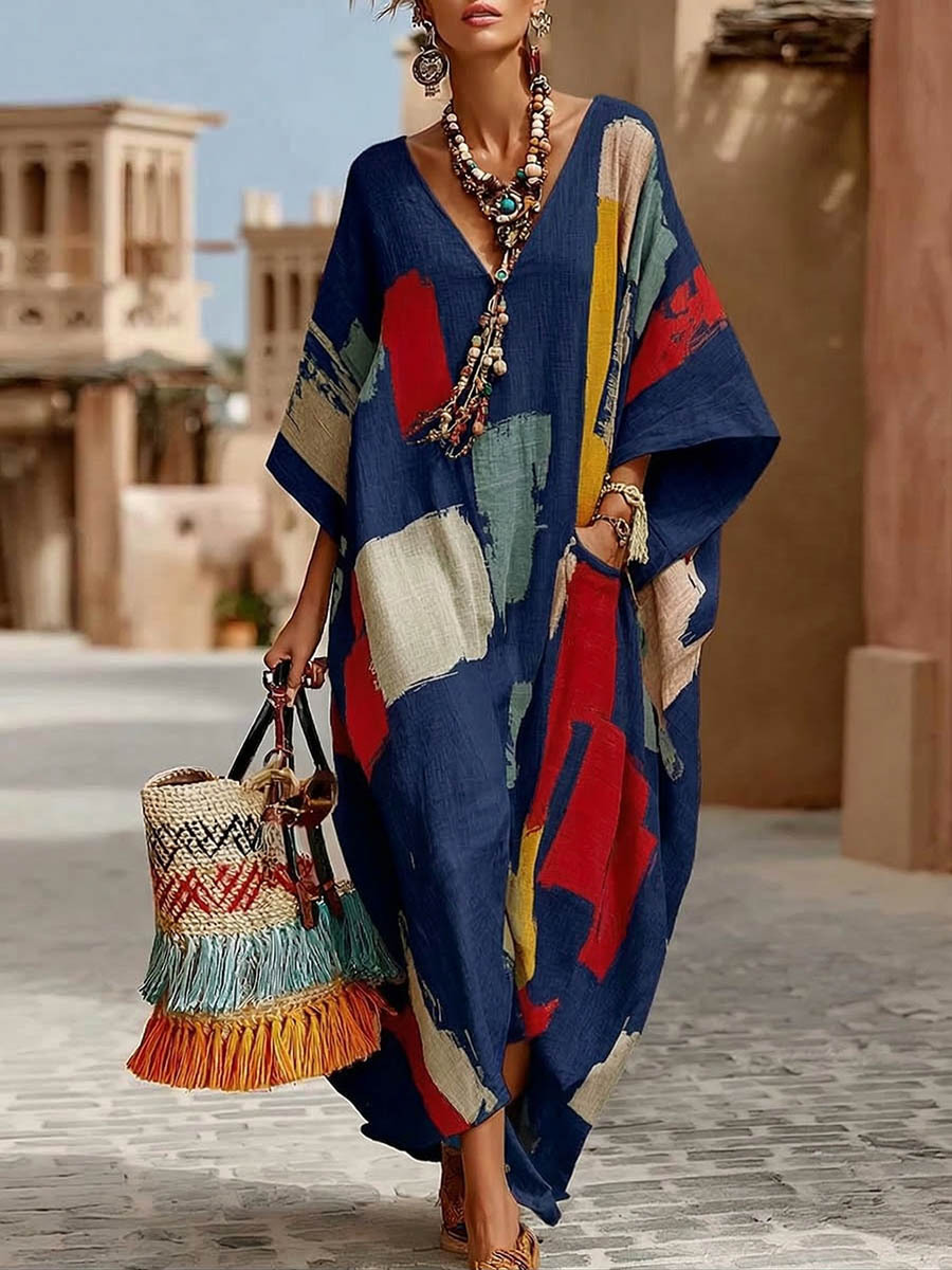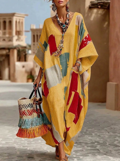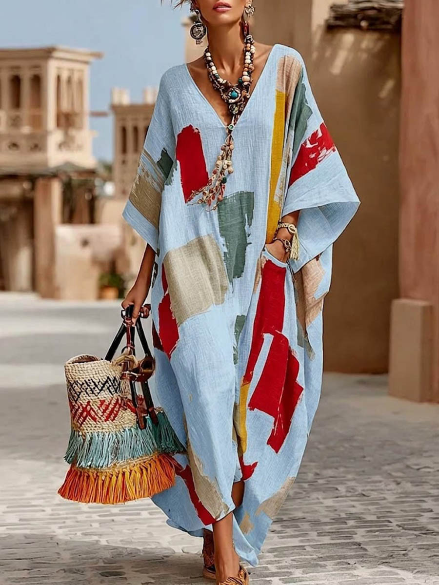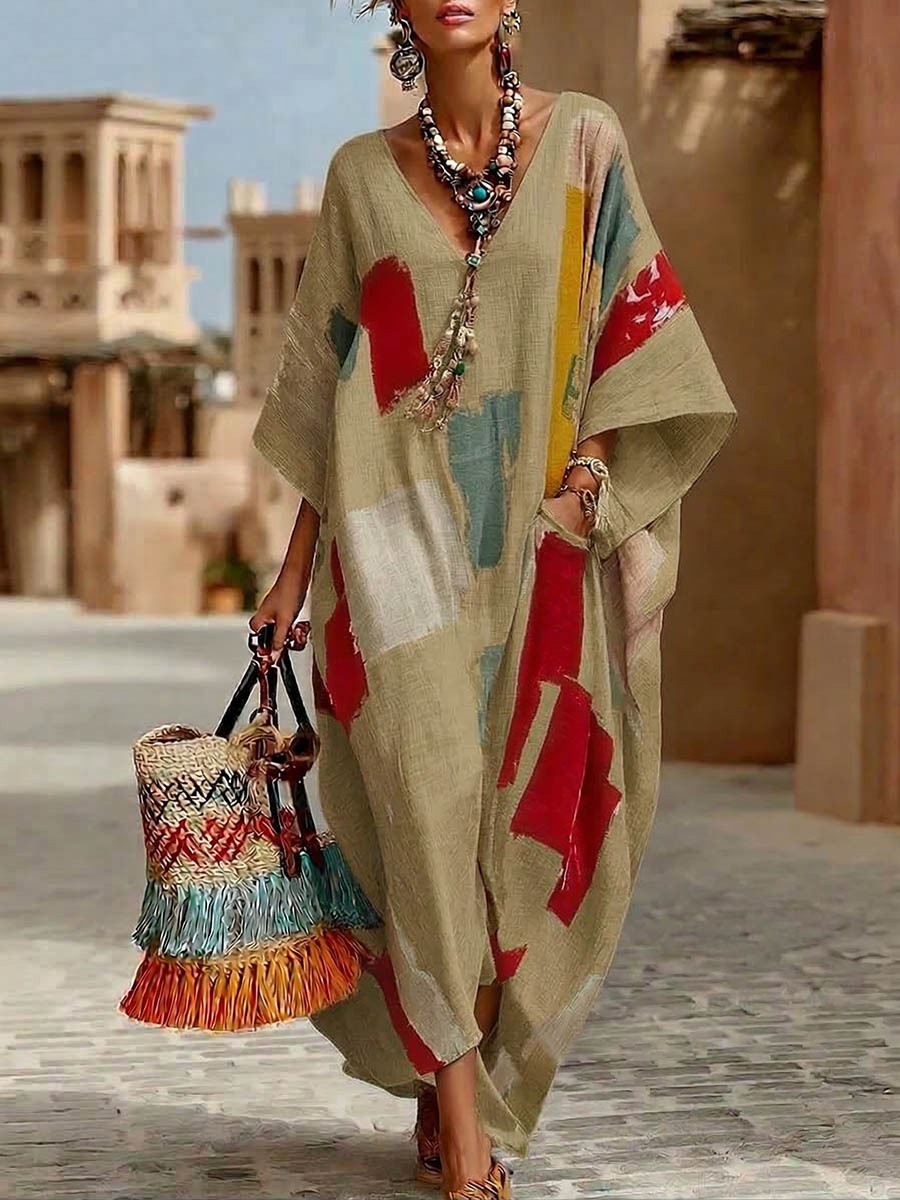 Women's Abstract Print V-Neck 3/4Sleeve Casual Loose Cotton-Linen Dress