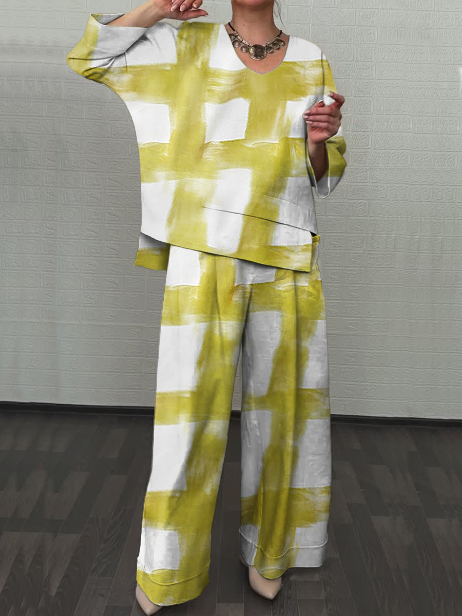 Women's Brushstroke Print Cotton and Linen Top and Pants Two-Piece Set