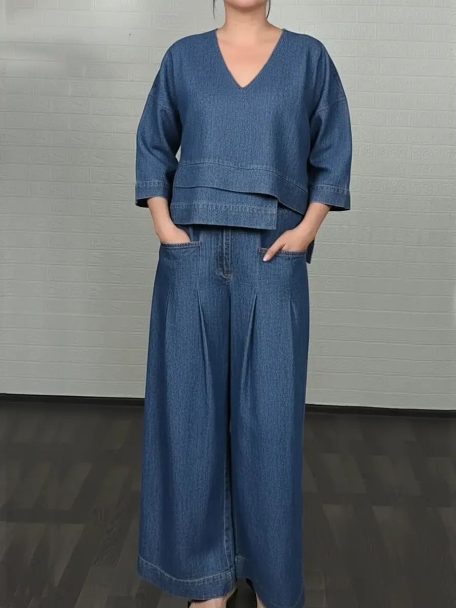Women's Casual Denim Cotton Top And Pants Two-piece Set