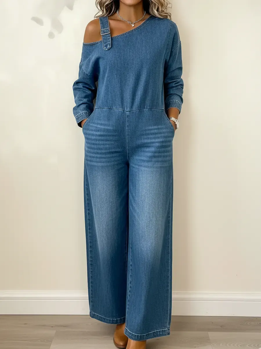 Women's Fashionable Off-the-shoulder Denim Jumpsuit