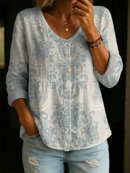 Women's Floral Pattern Art Print Casual Cotton Linen Shirt