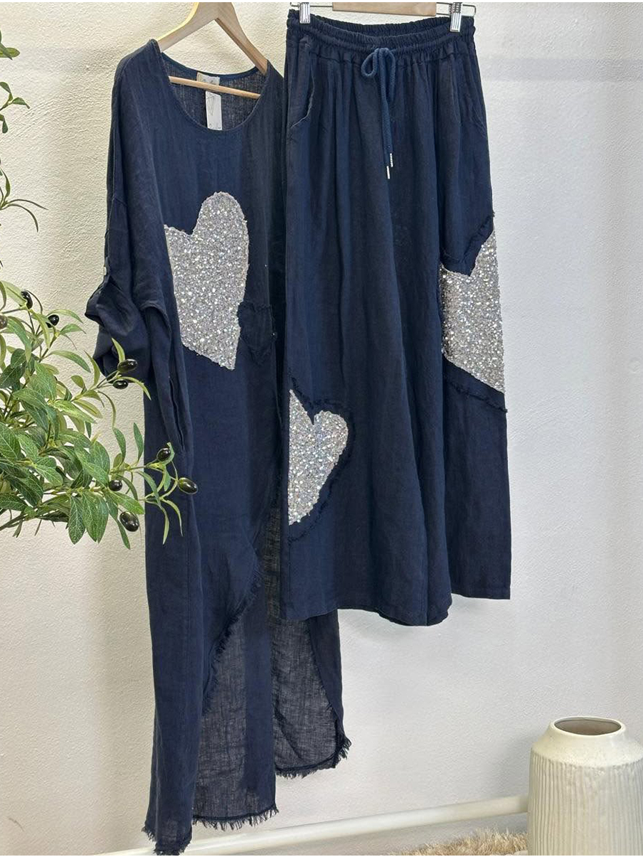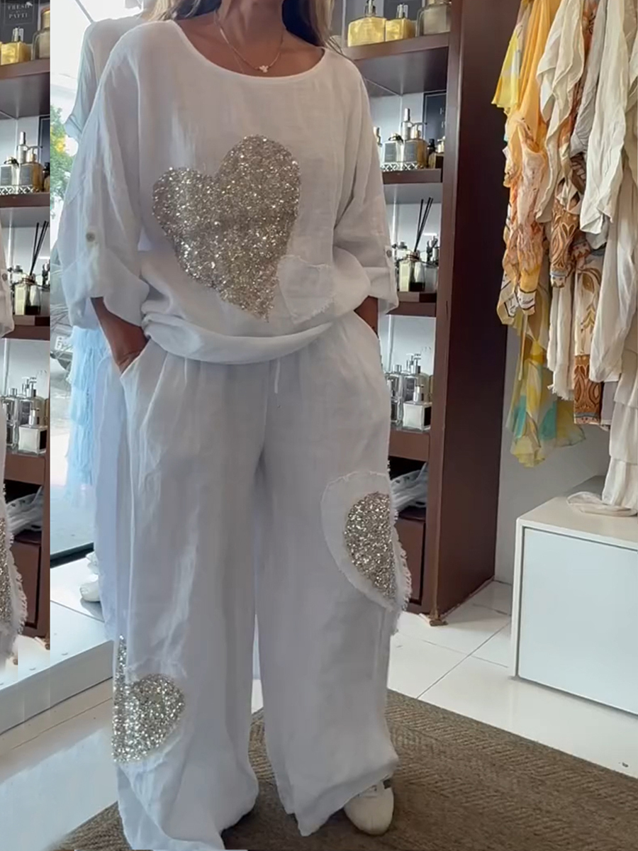 Women's Heart-patterned Printed Casual Cotton Linen Two-piece Set