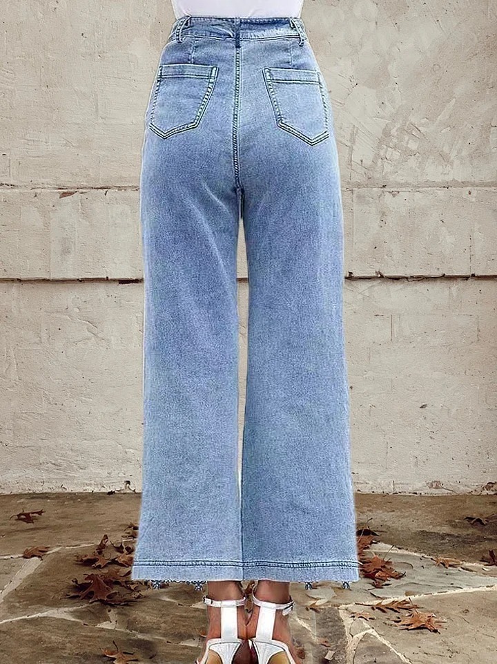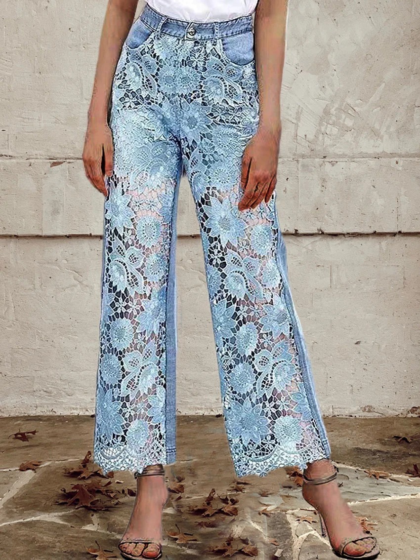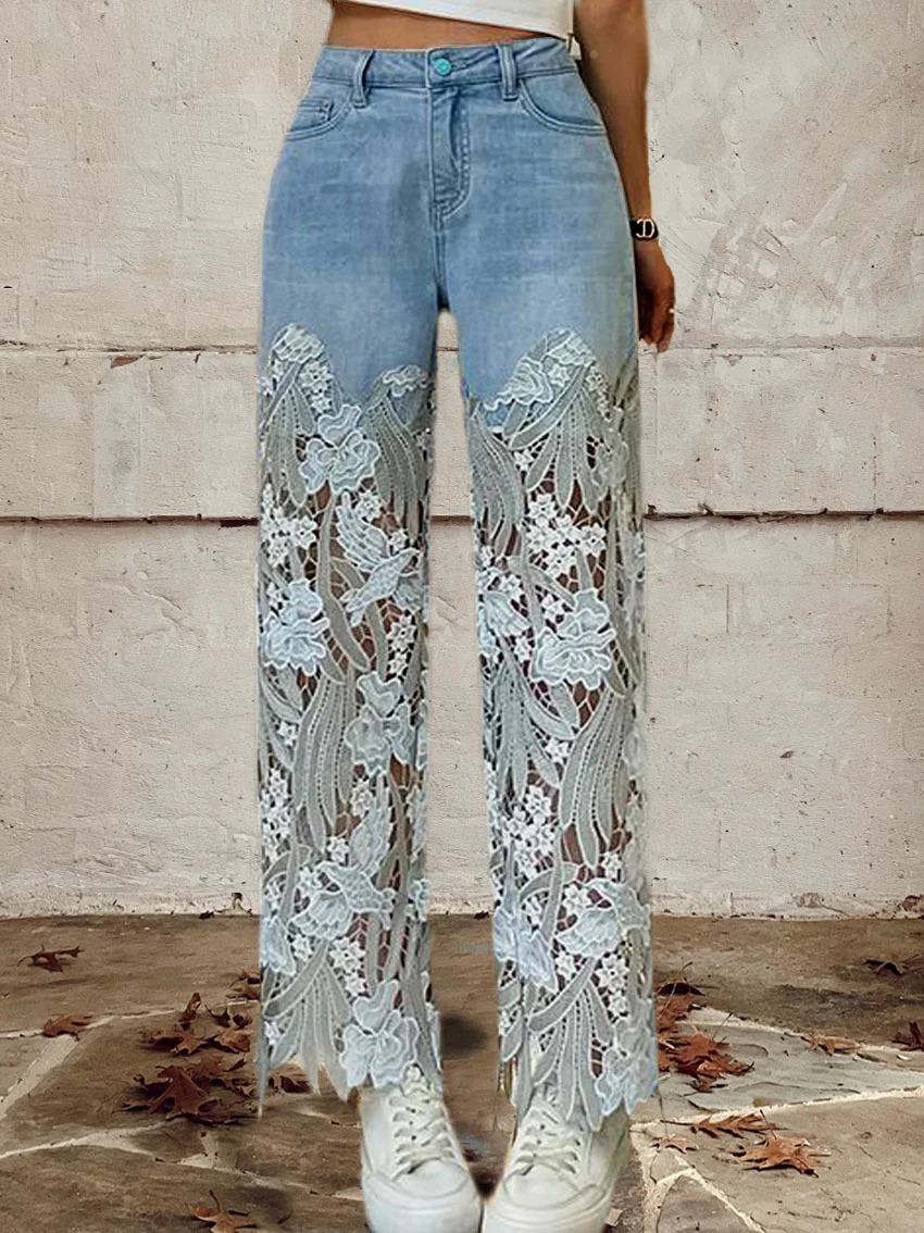 Women's Mid Waist Buttoned Lace Patchwork Jeans