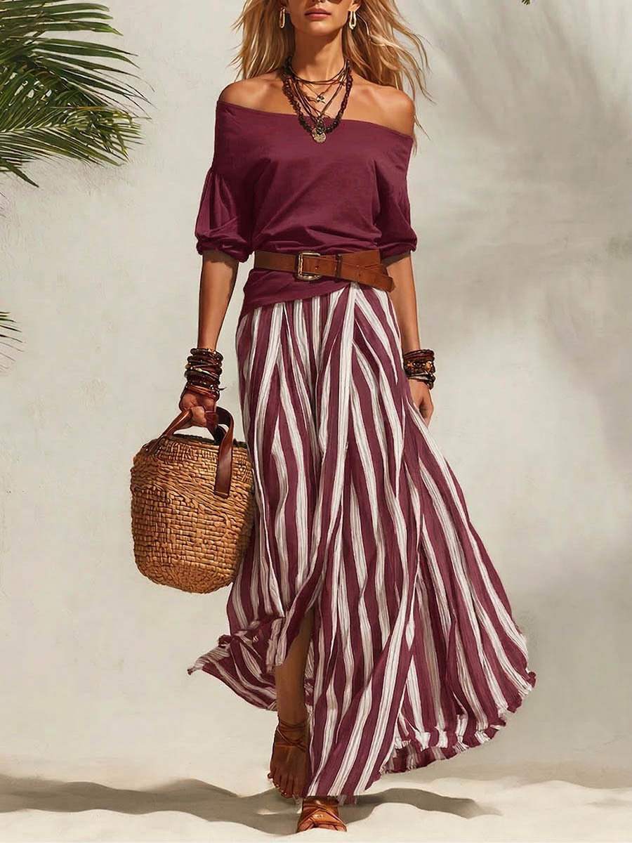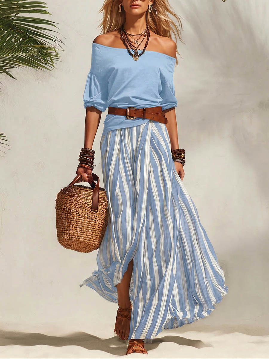Women's Off-shoulder 3/4-sleeve Casual Top & High-waisted Skirt Cotton Set
