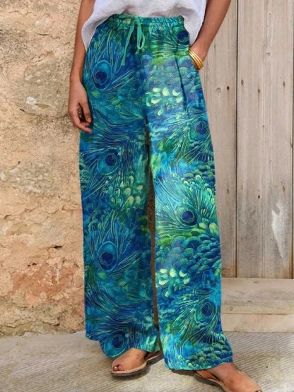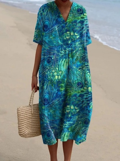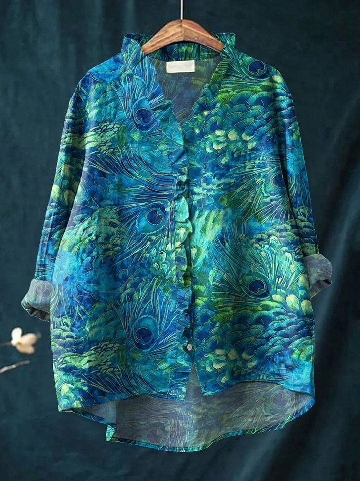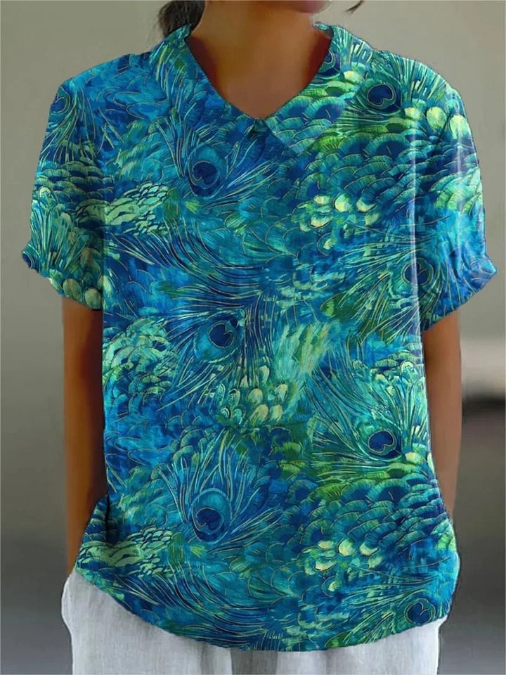 Women's Peacock Feather Pattern Art Print Casual Cotton Linen V-neck Shirt
