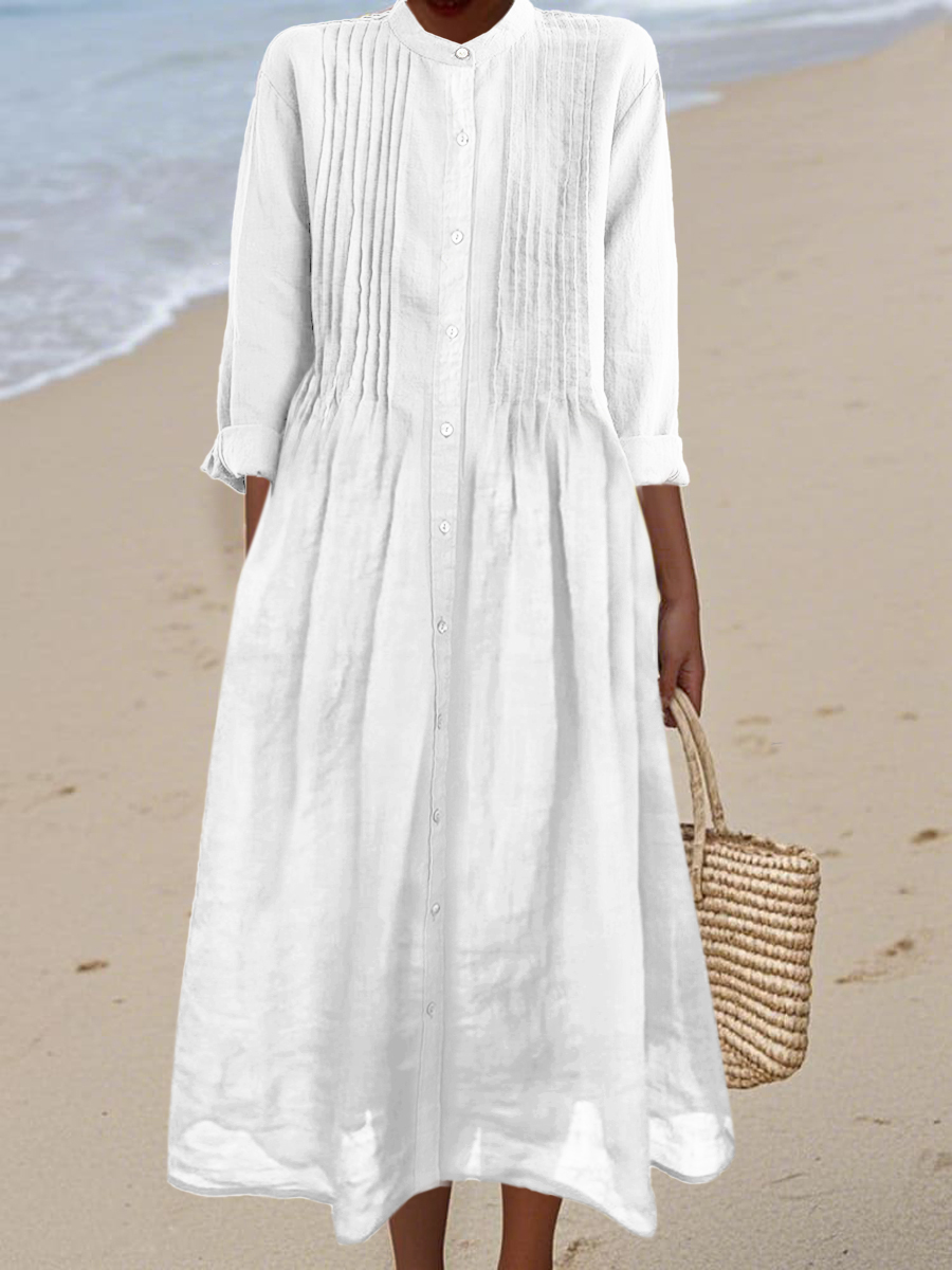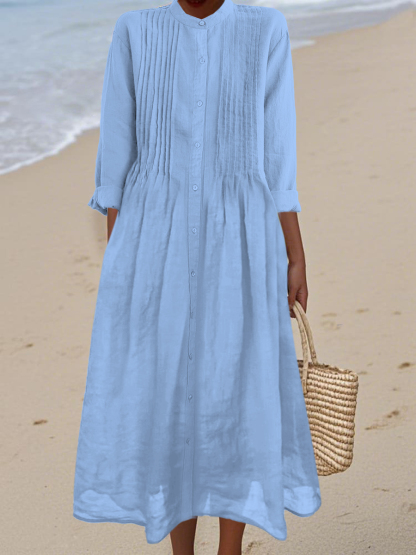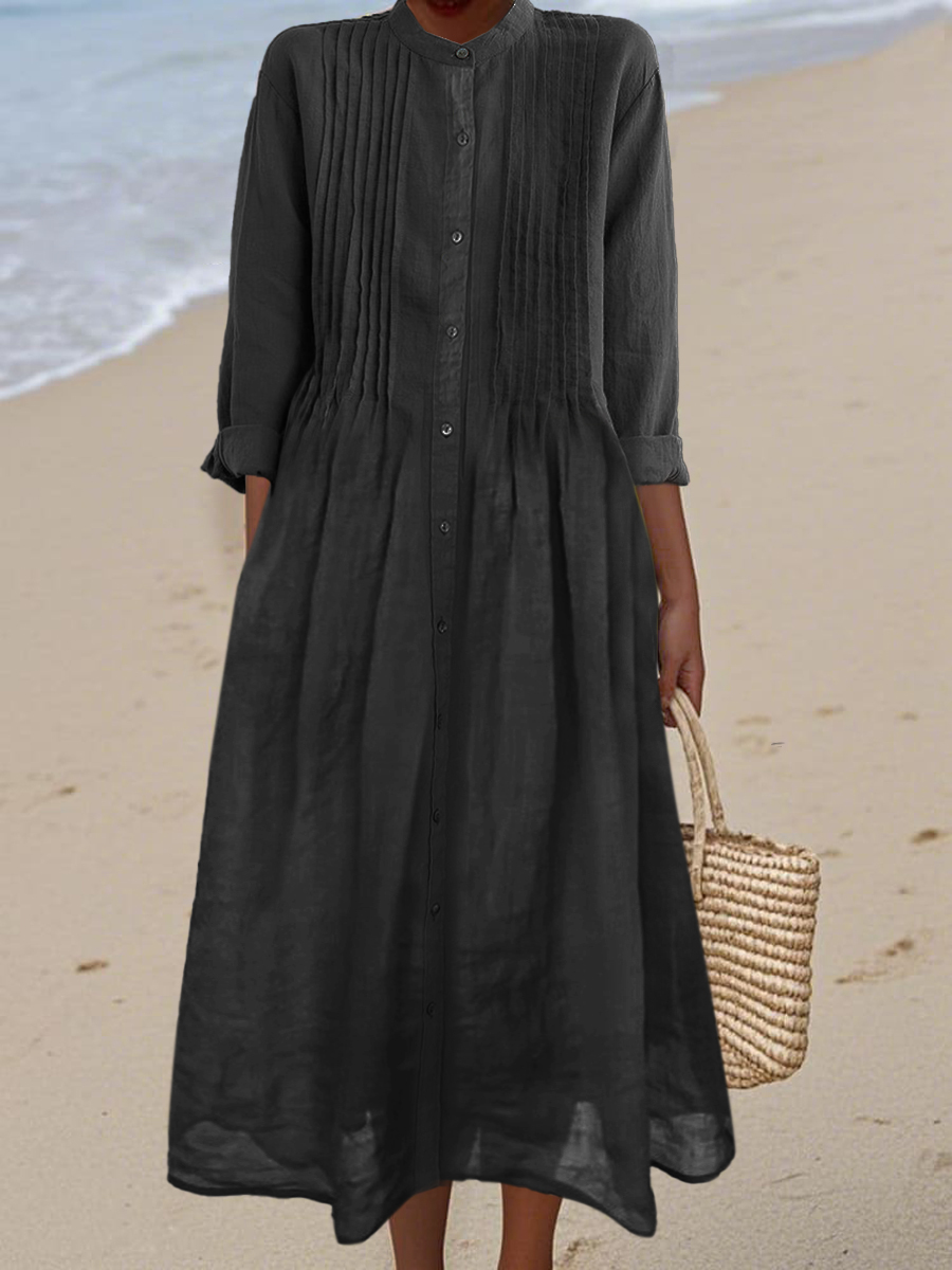 Women's Pleated Cotton and Ramie Long-sleeved Dress