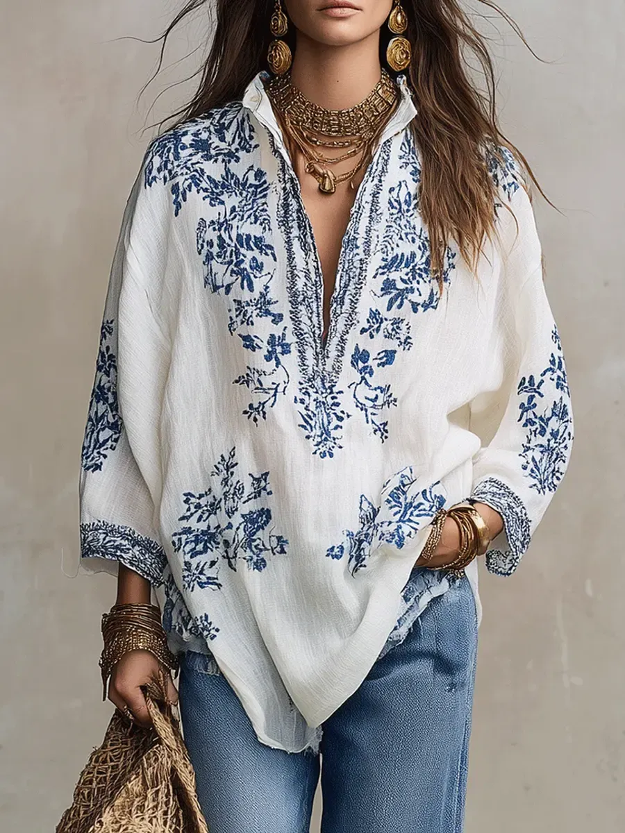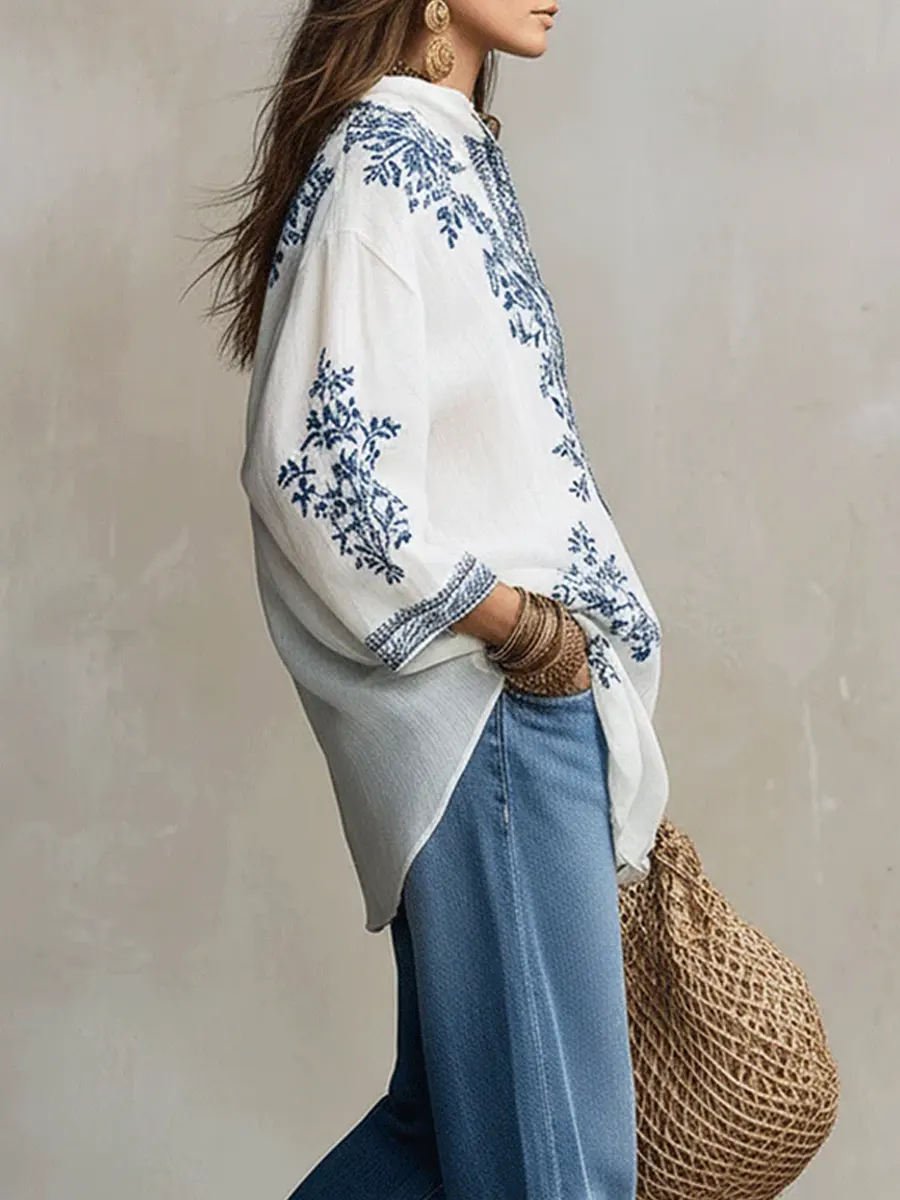 Women's Retro Ethnic Floral Art Print Casual Cotton Shirt