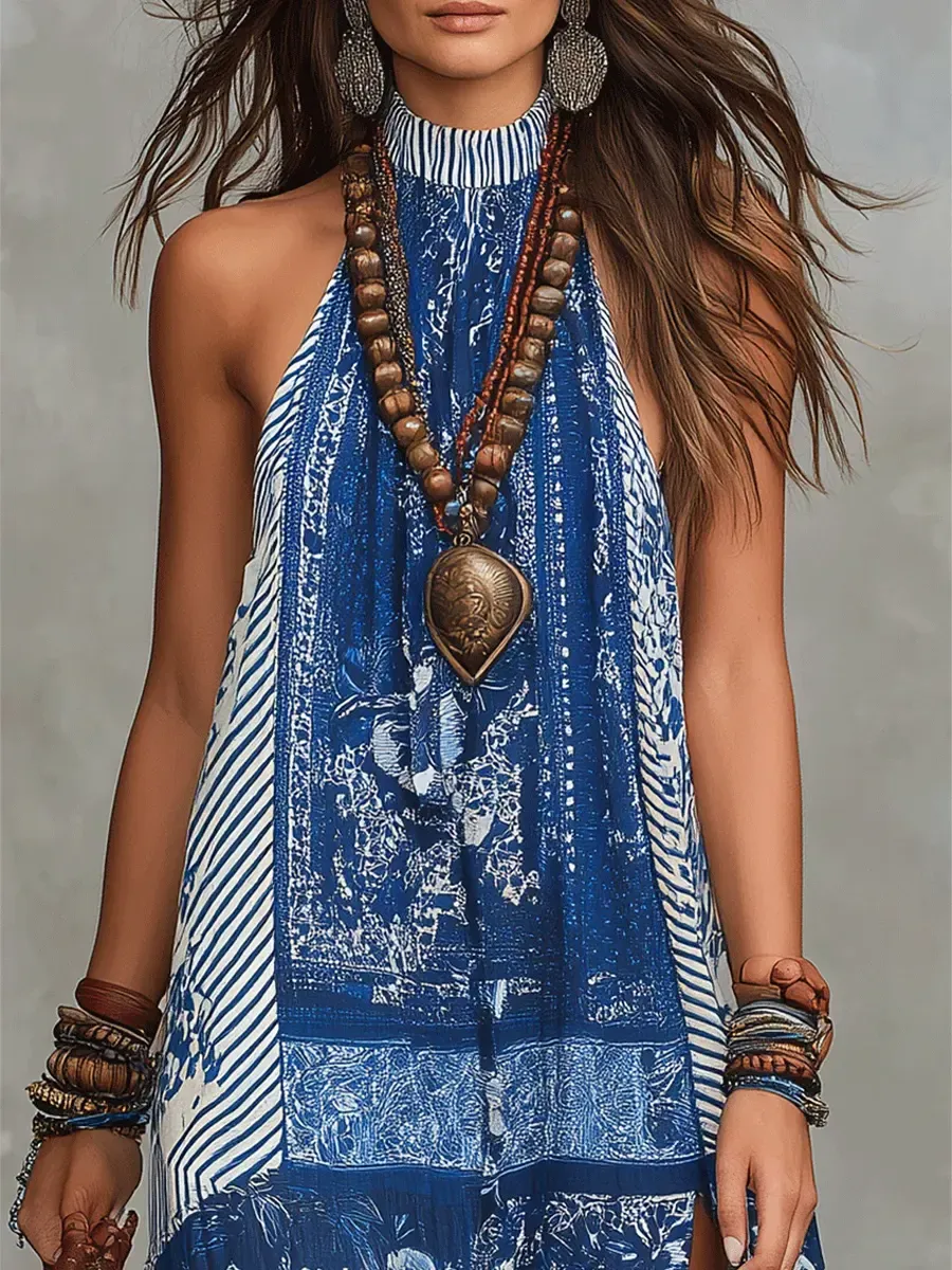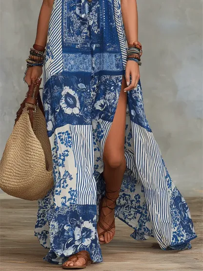 Women's Retro Ethnic Floral Pattern Art Print Casual Fashion Cotton Maxi Dress