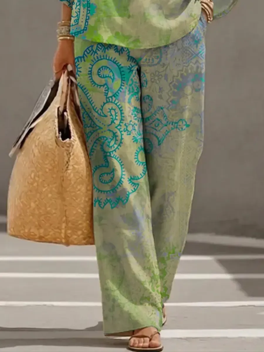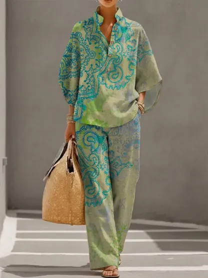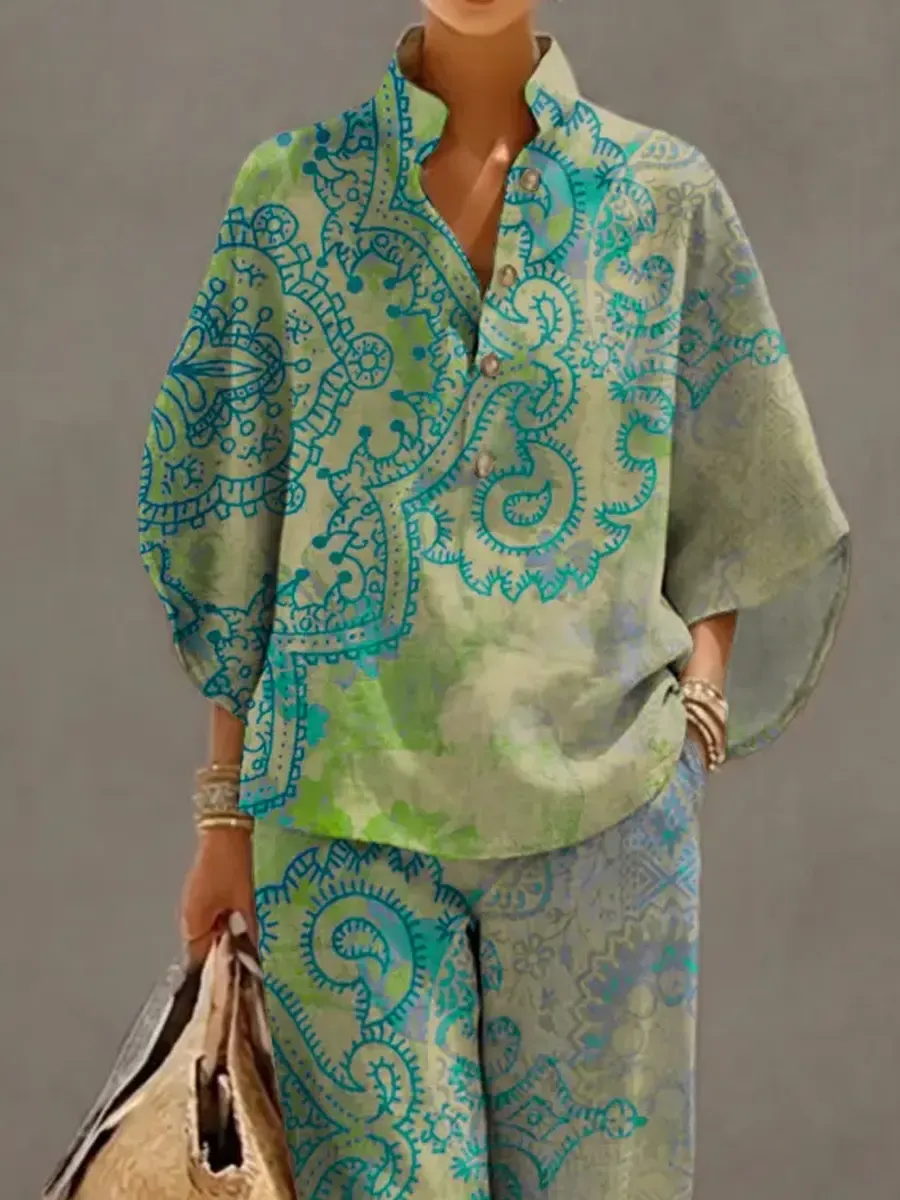 Women's Retro Floral Art Print Casual 3/4 Sleeve Top And Pants Cotton Linen Suits