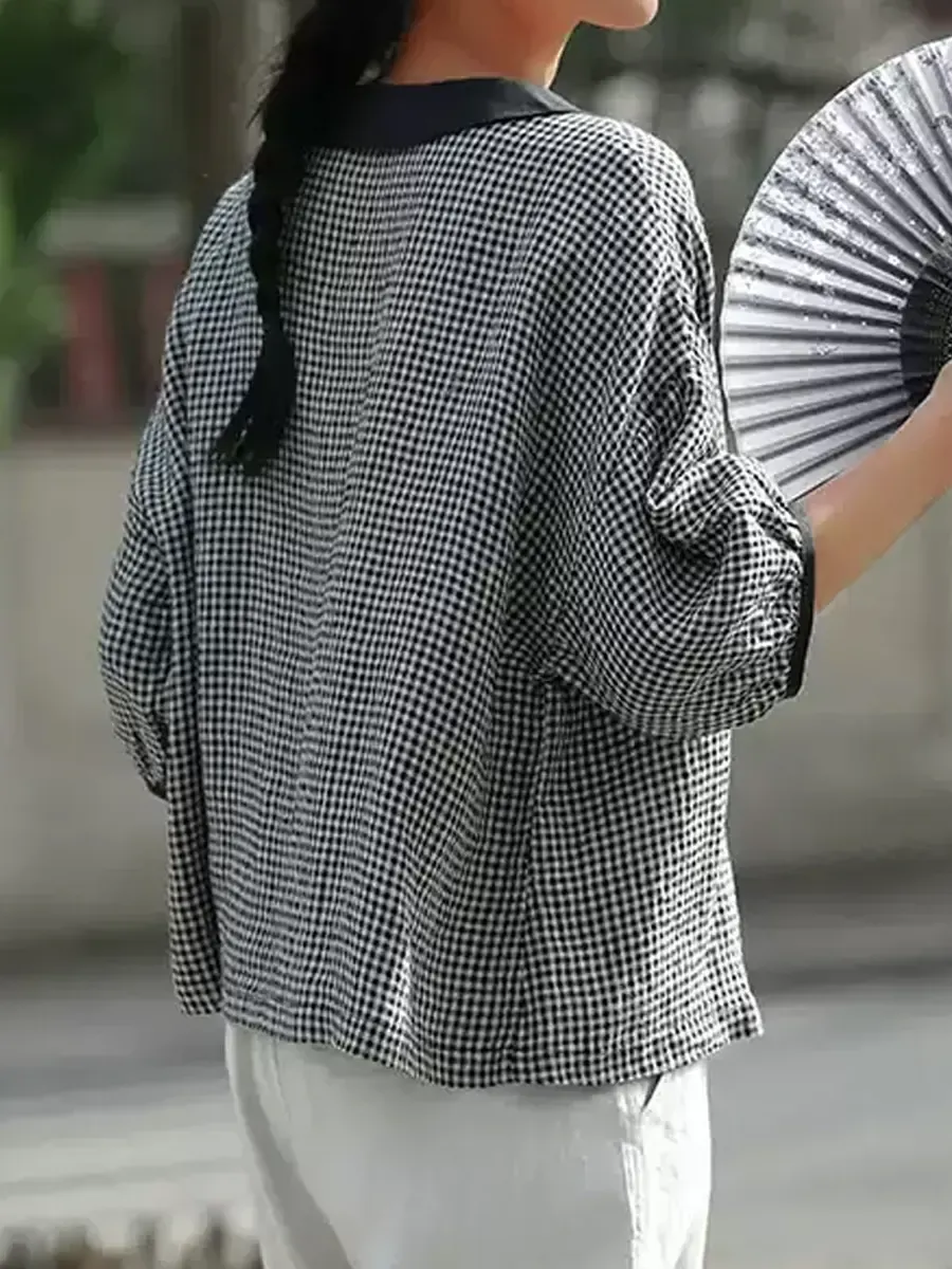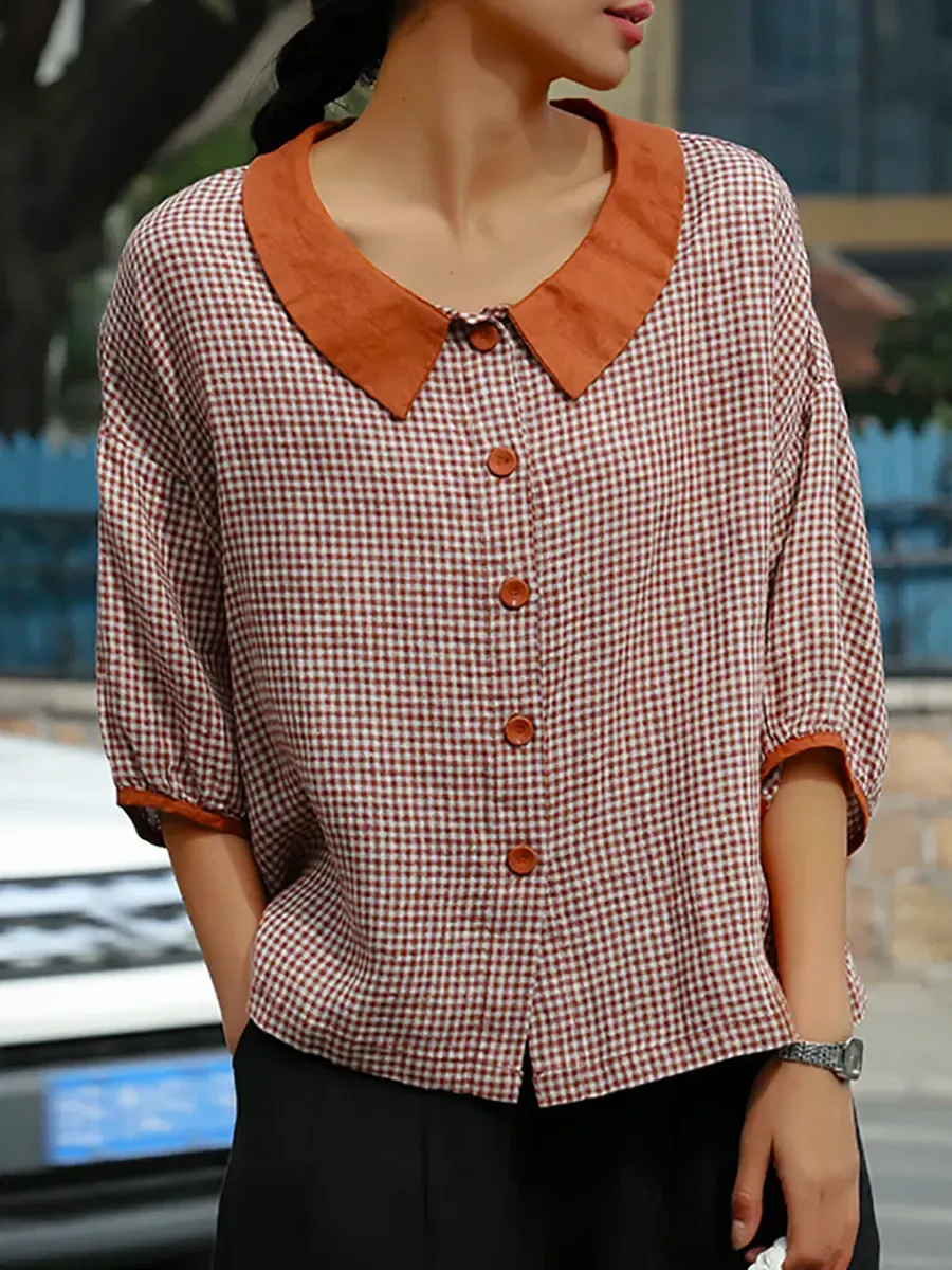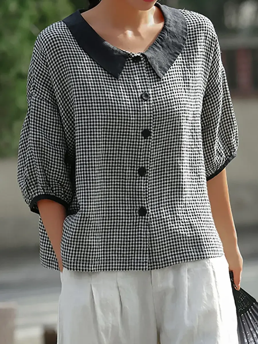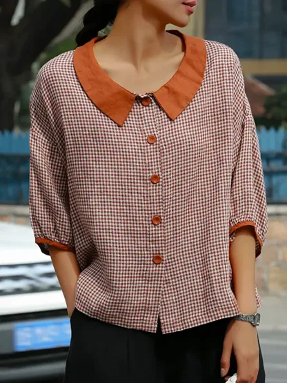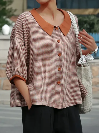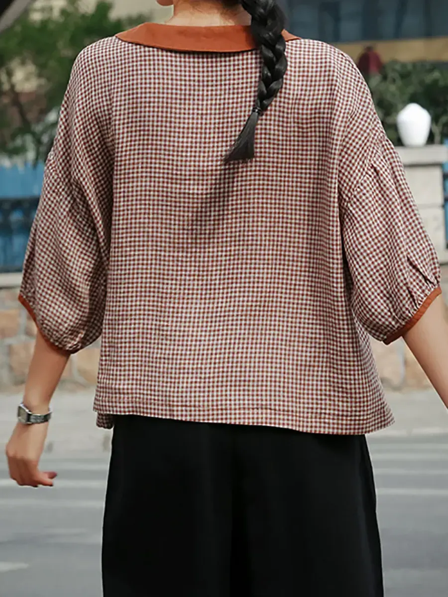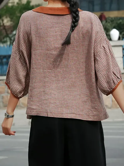 Women's Retro Plaid Pattern Art Casual 3/4 Sleeve Cotton Shirt