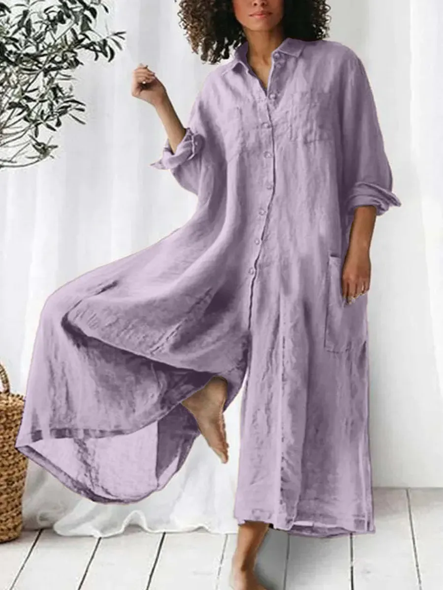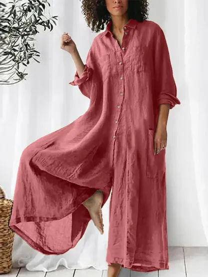 Women's Solid Color Art Casual Long Sleeve Cotton Linen Jumpsuit