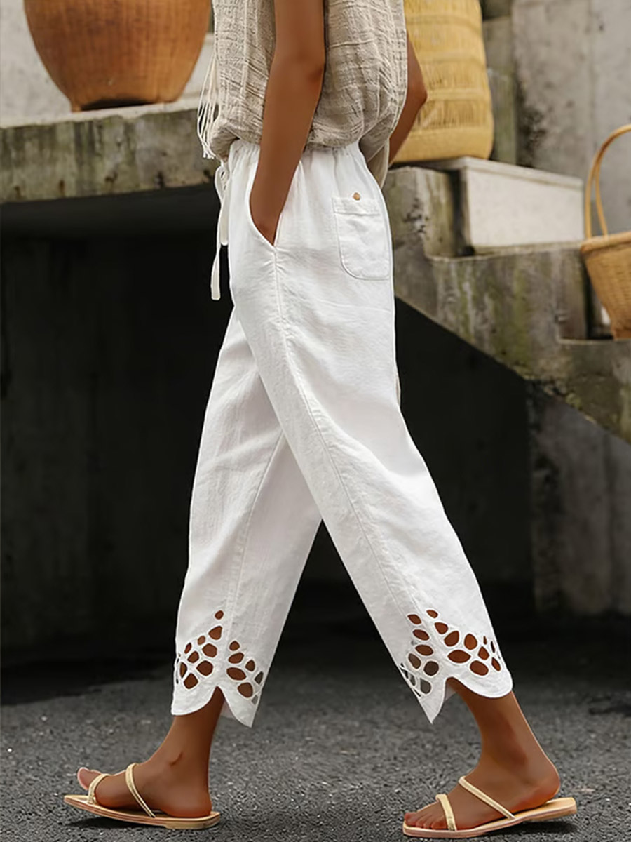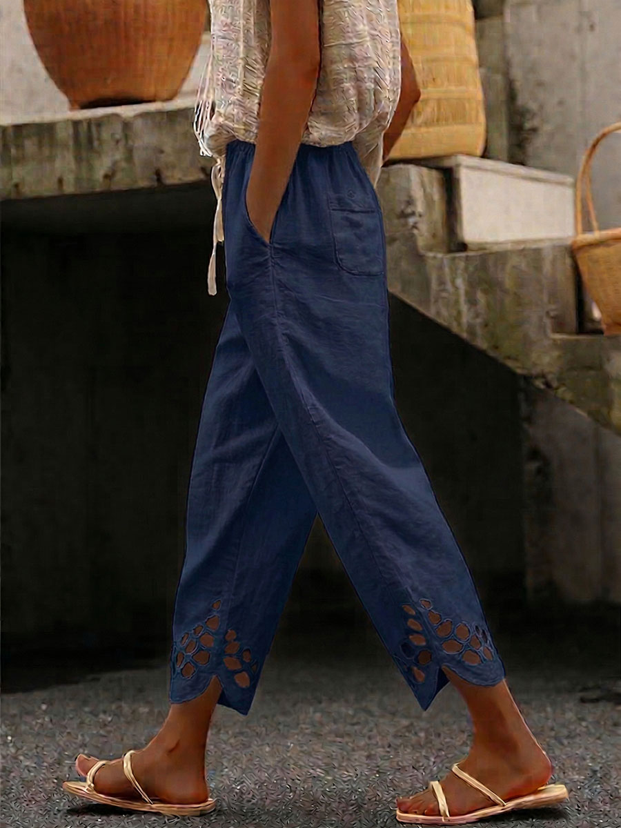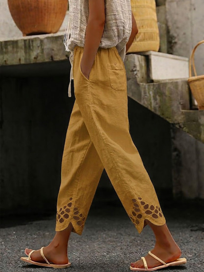 Women's Solid-Color Casual Loose Cotton-Linen Wide-Leg Pants with Elastic Waist