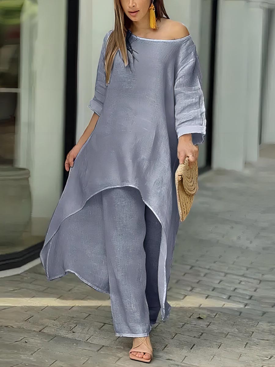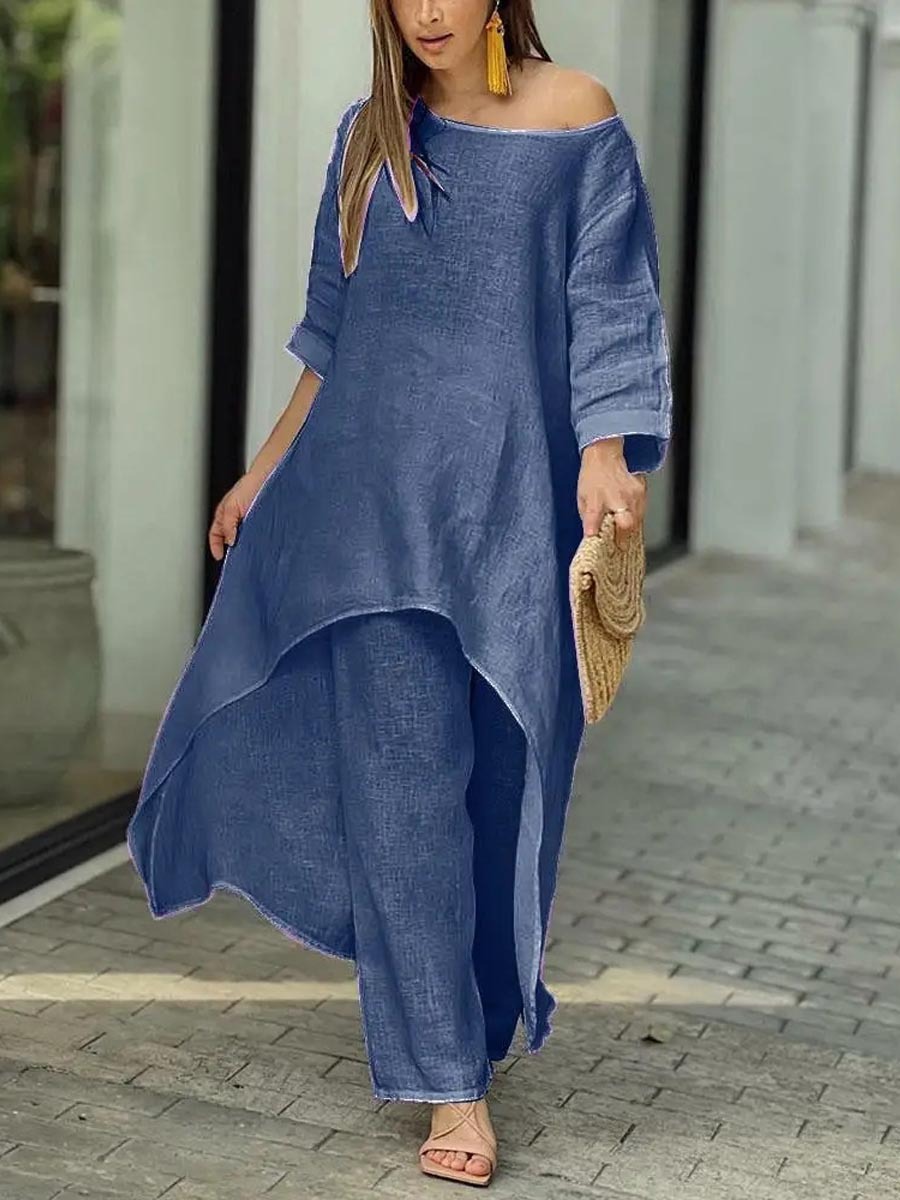 Women's Solid Color Casual Loose Stylish Cotton And Linen Top Pants Suit