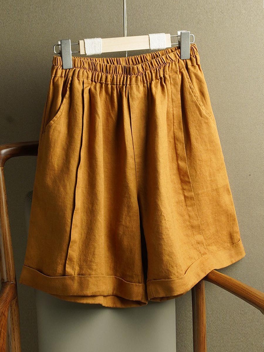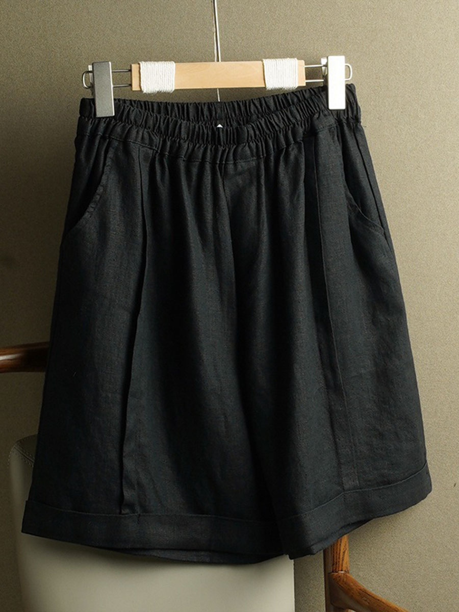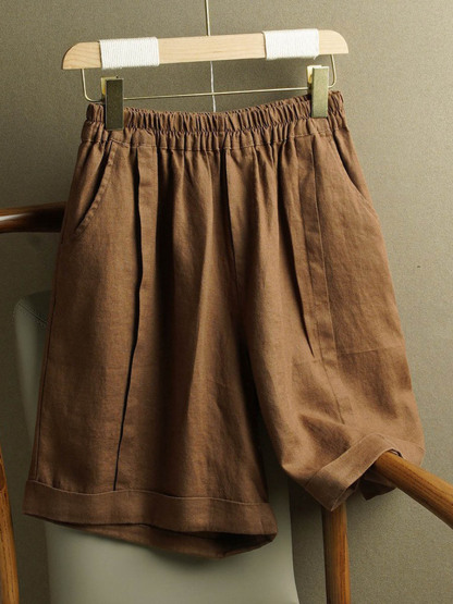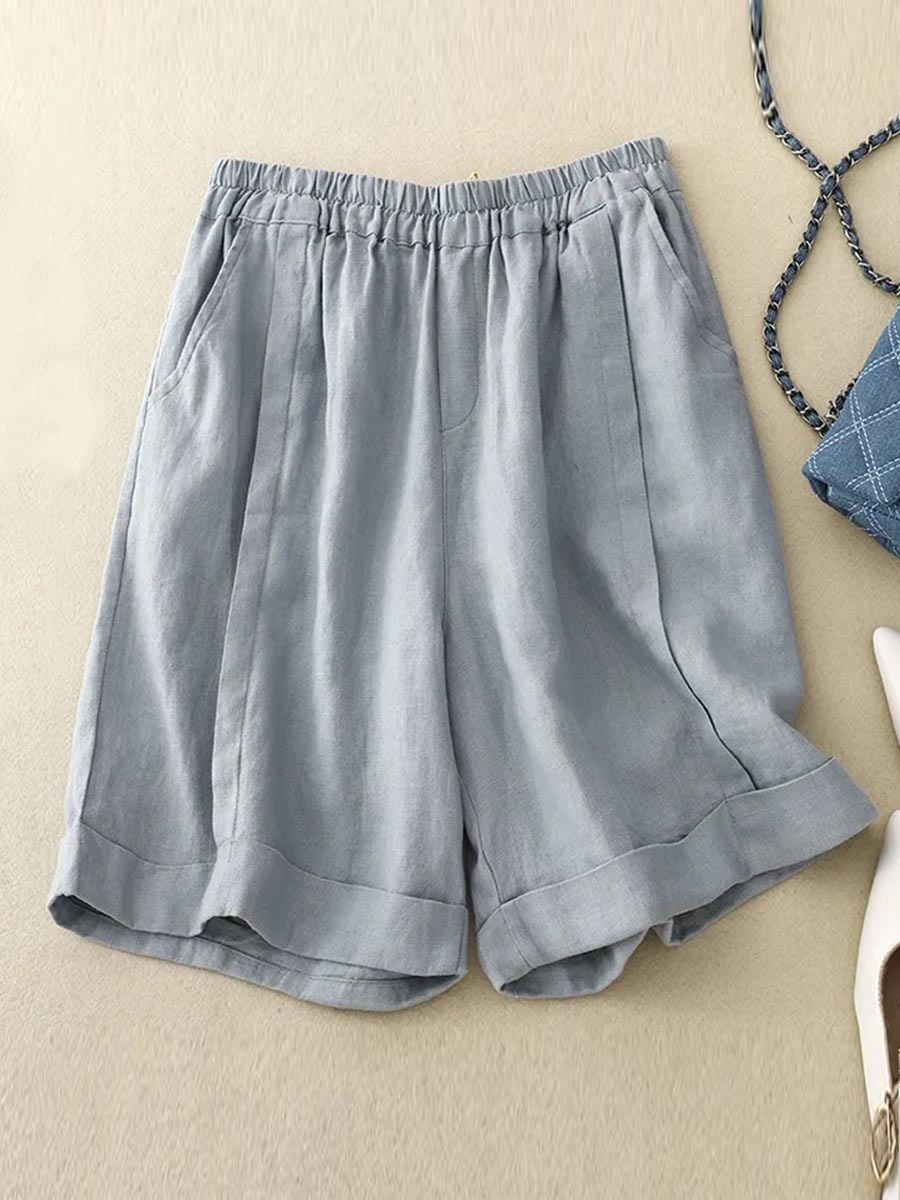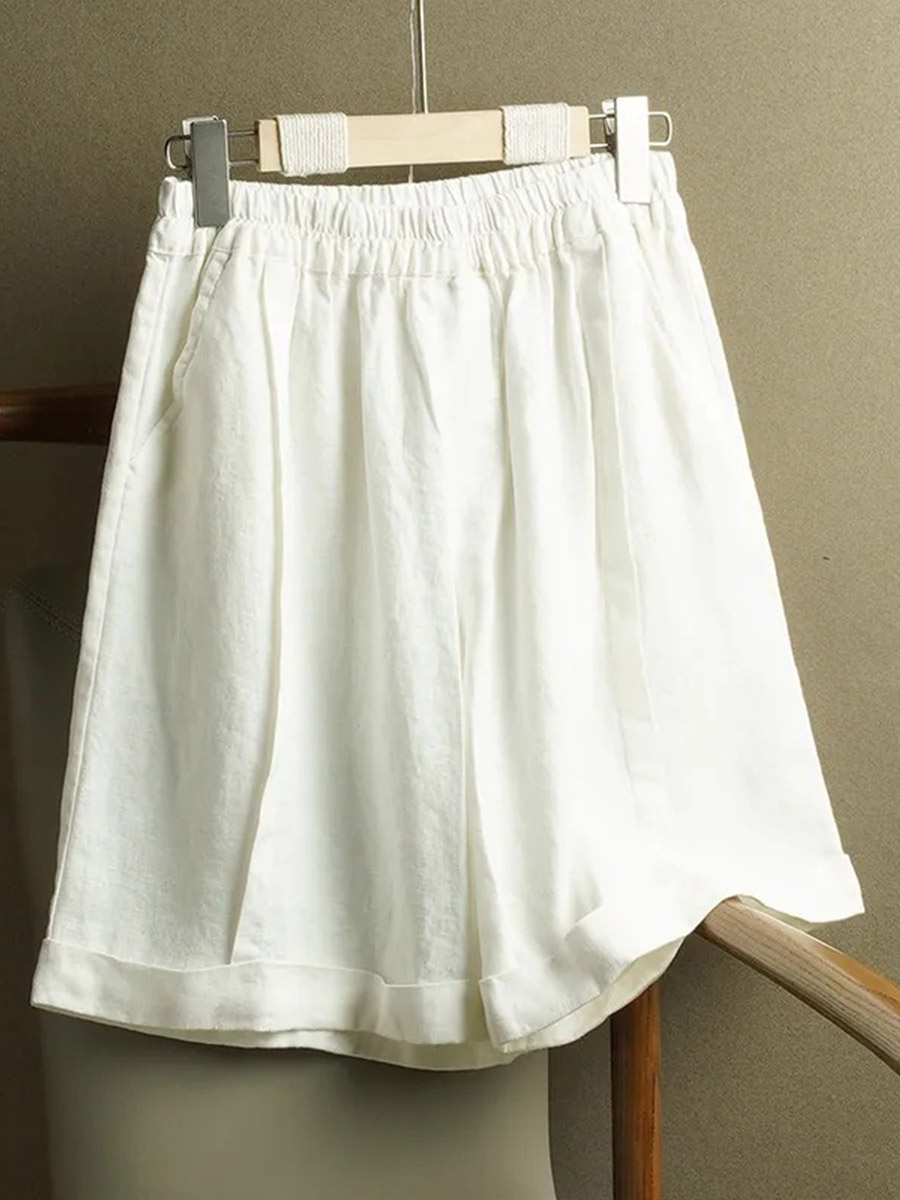 Women's Solid Color Elastic Waist Cotton and Linen Wide Leg Shorts