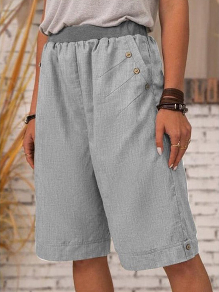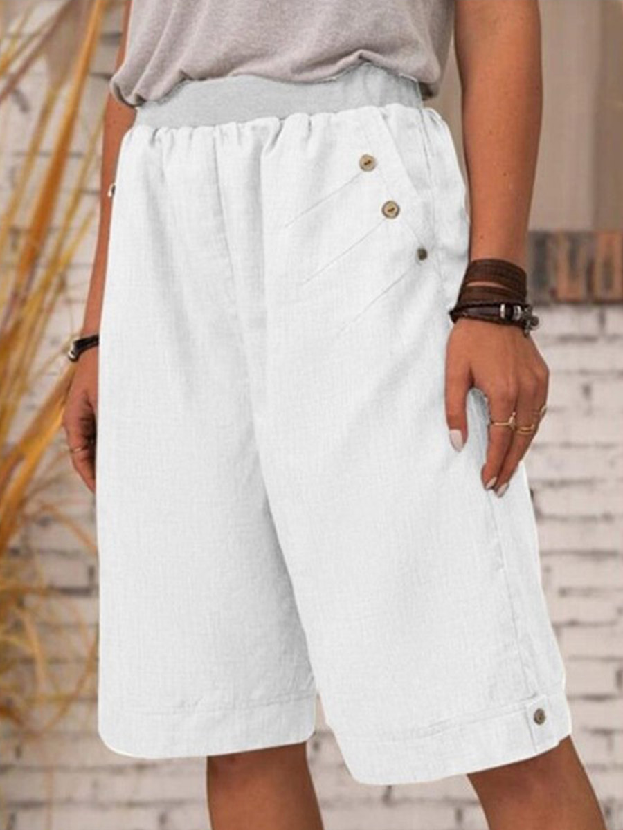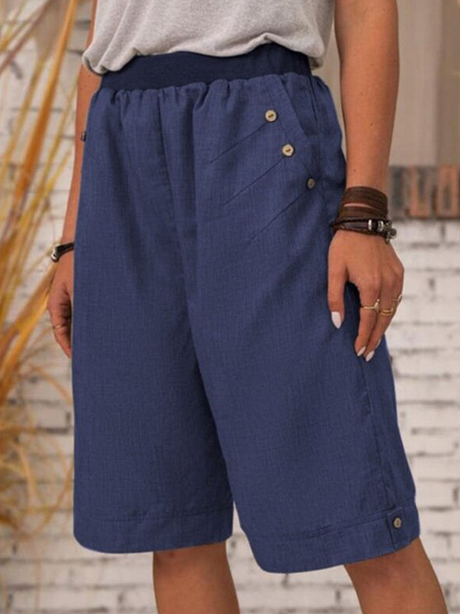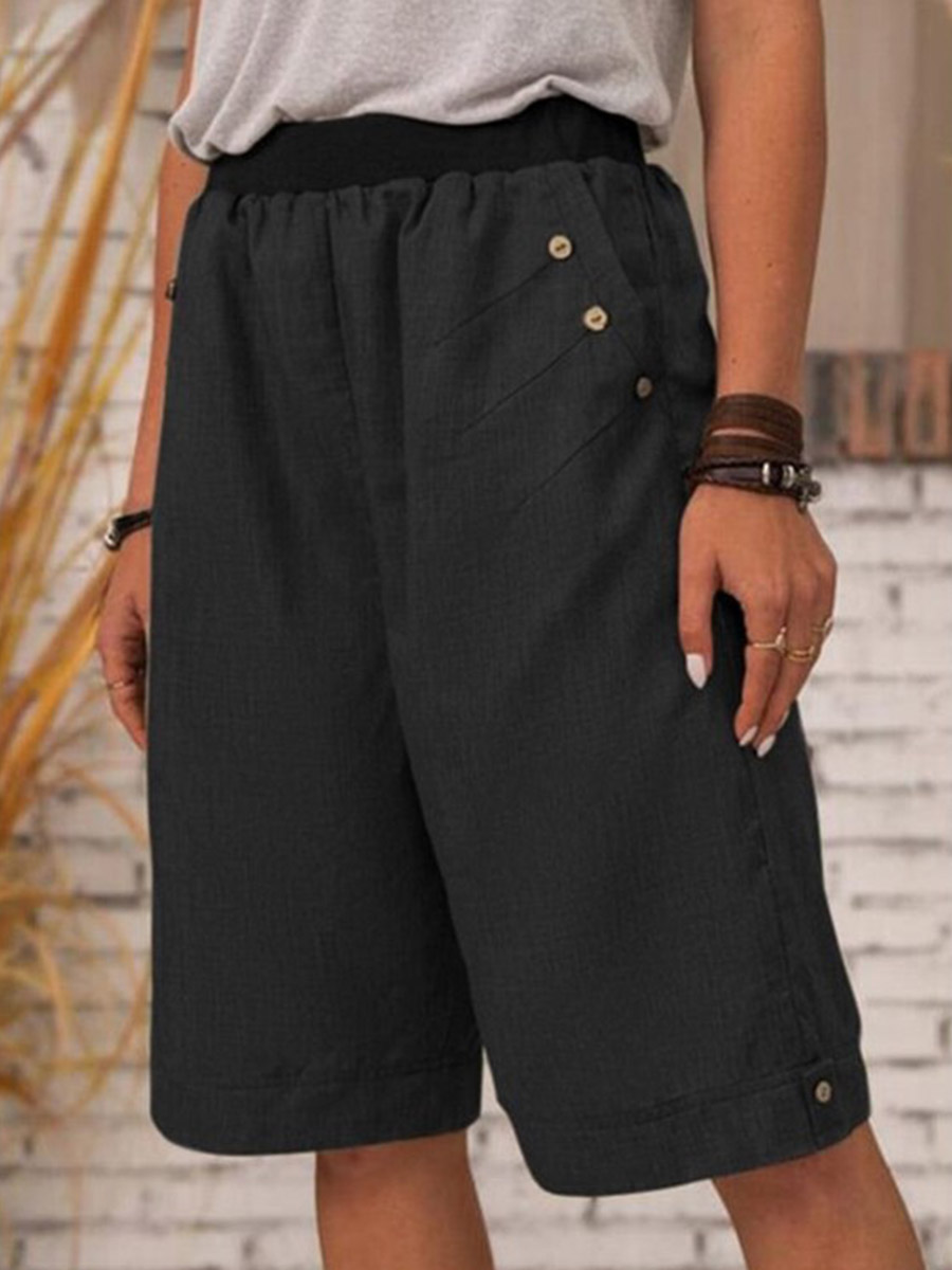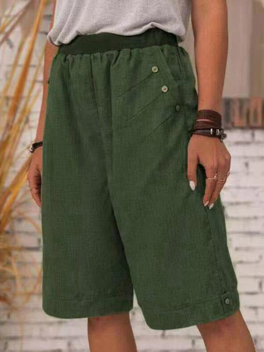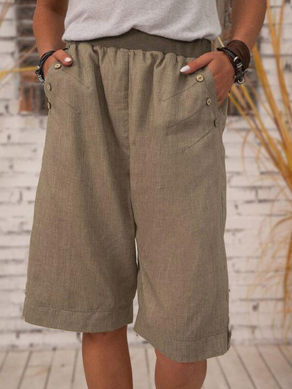 Women's Solid Color Elastic Waist Loose Casual Pockets Cotton and Linen Shorts