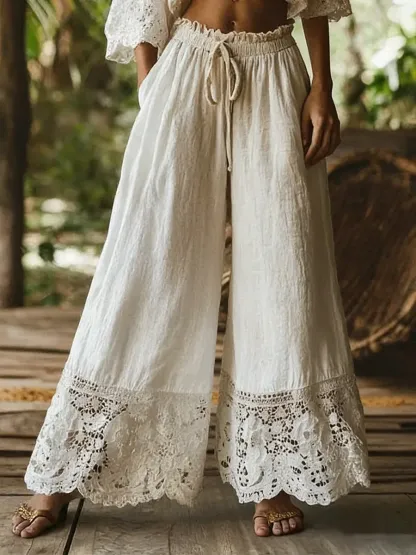 Women's Solid Color High-waisted Drawstring Wide-leg Pants With Cotton And Linen Lace Trim