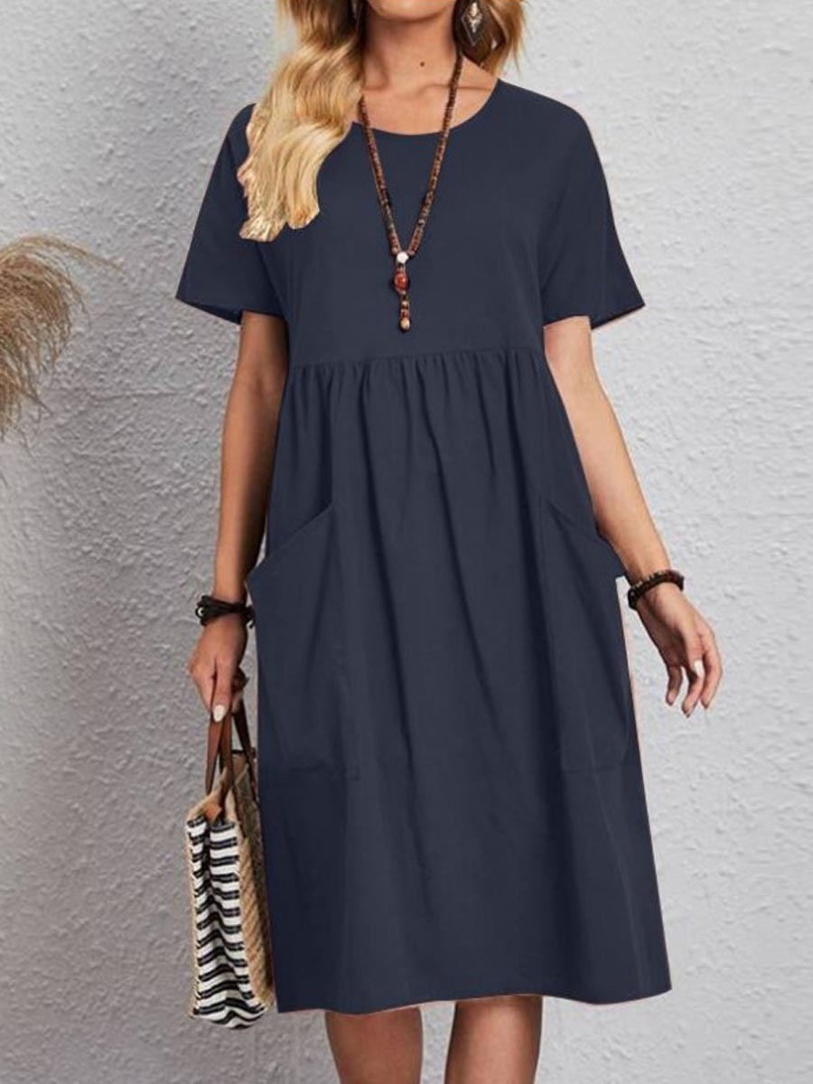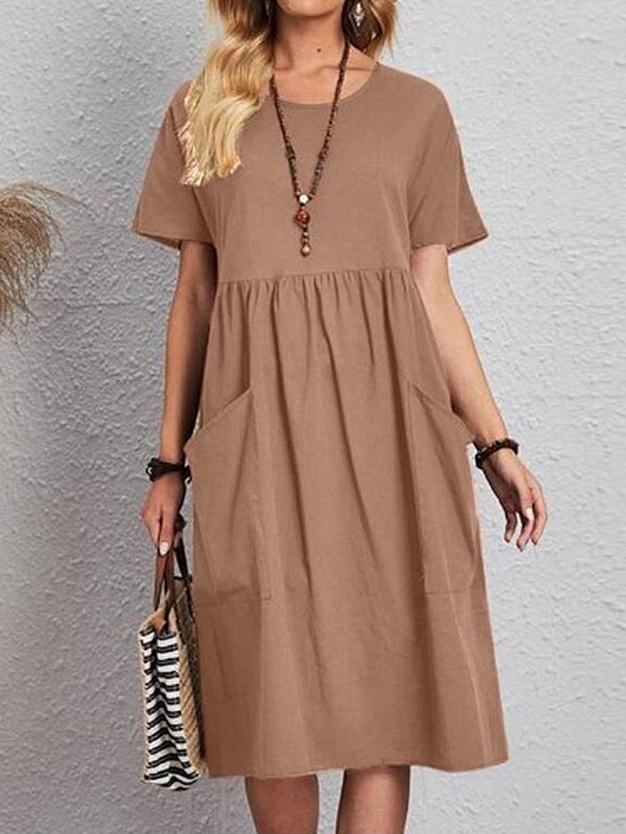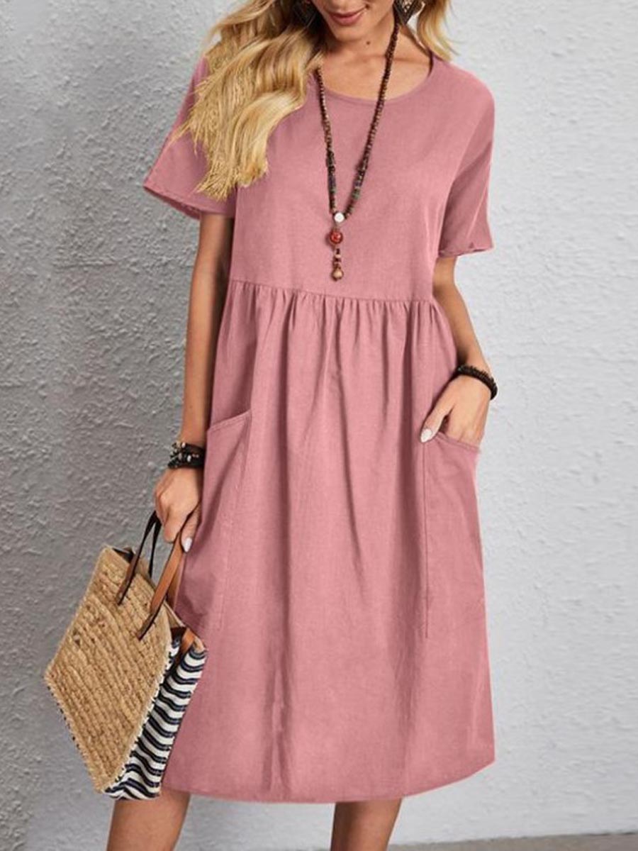 Women's Solid Color Loose Stylish Casual Cotton And Linen Pockets Dress