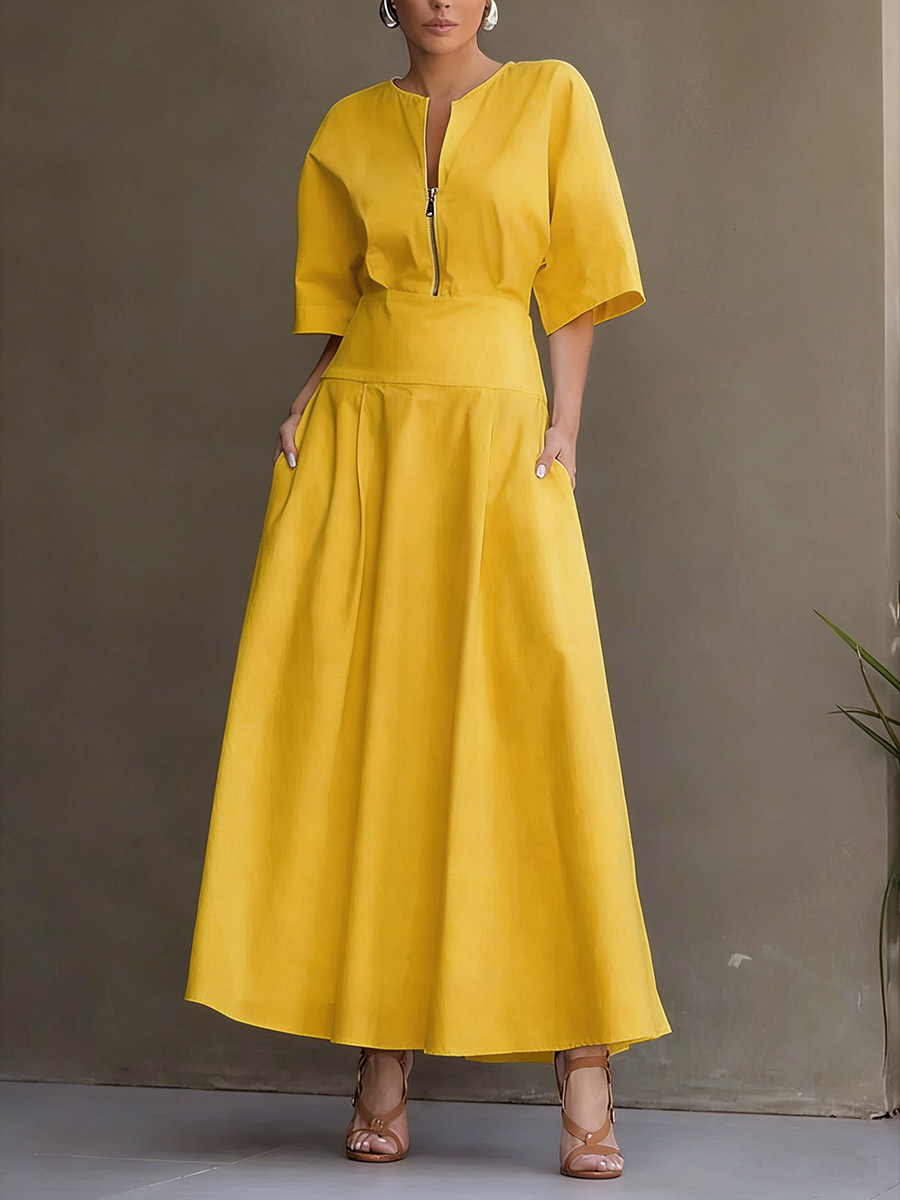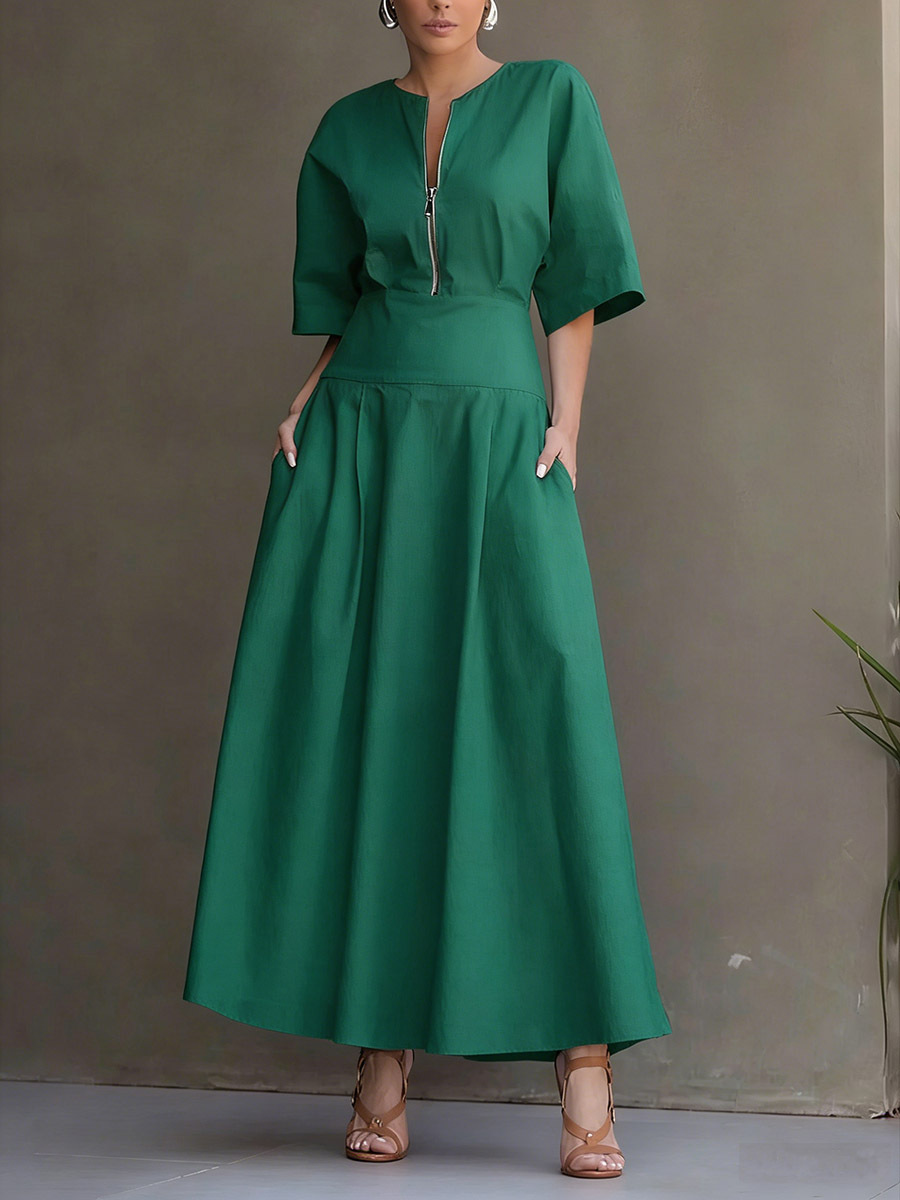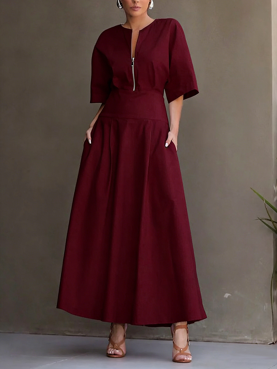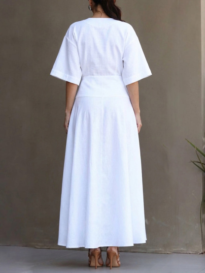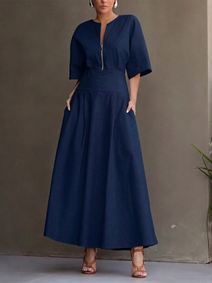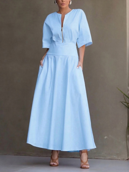 Women's Solid-color Round-neck 3/4-sleeve Casual Loose Cotton-linen Dress