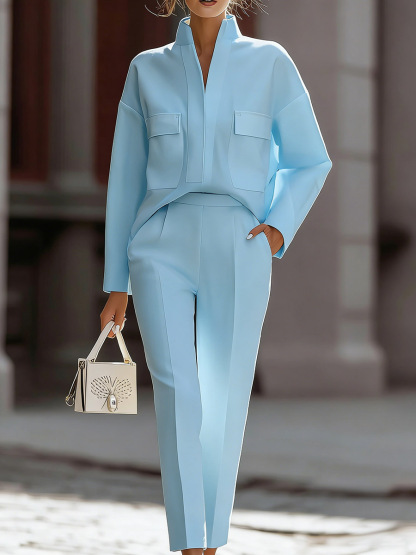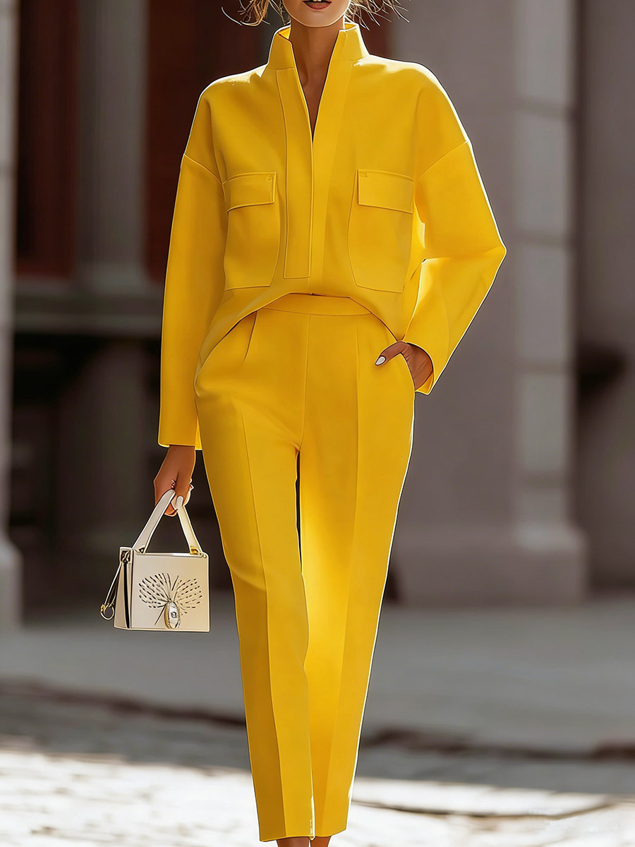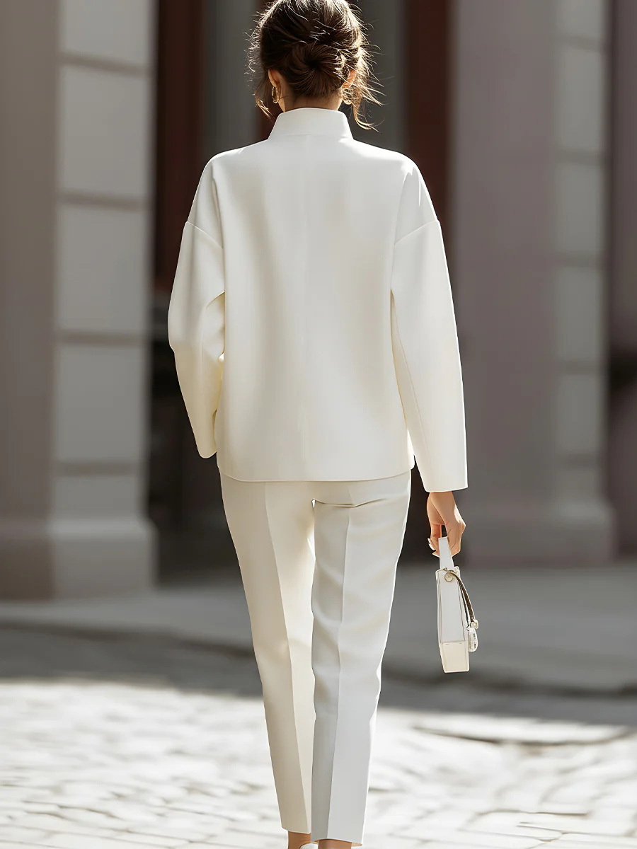 Women's Solid Color Stand Collar Long Sleeve Casual Loose Cotton Top And High Waist Casual Loose Trousers Set