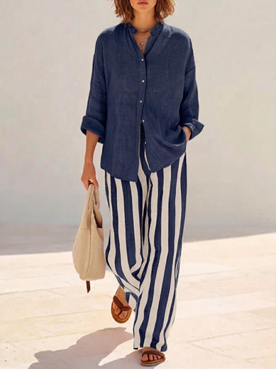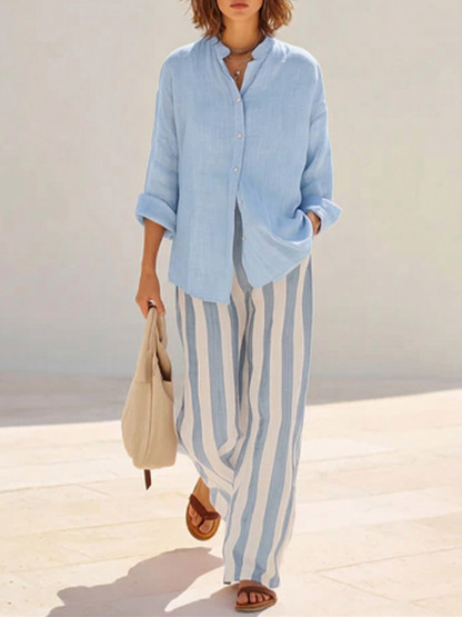Women's Solid-color Stand-collar Long-sleeve Loose-fit Cotton-linen Shirt & Elastic-waist Striped Wide-leg Pants Set