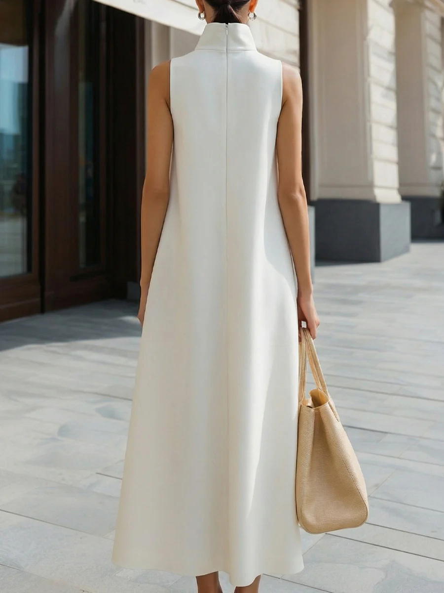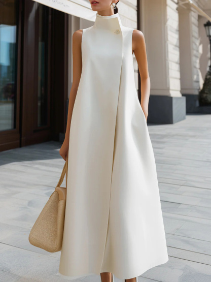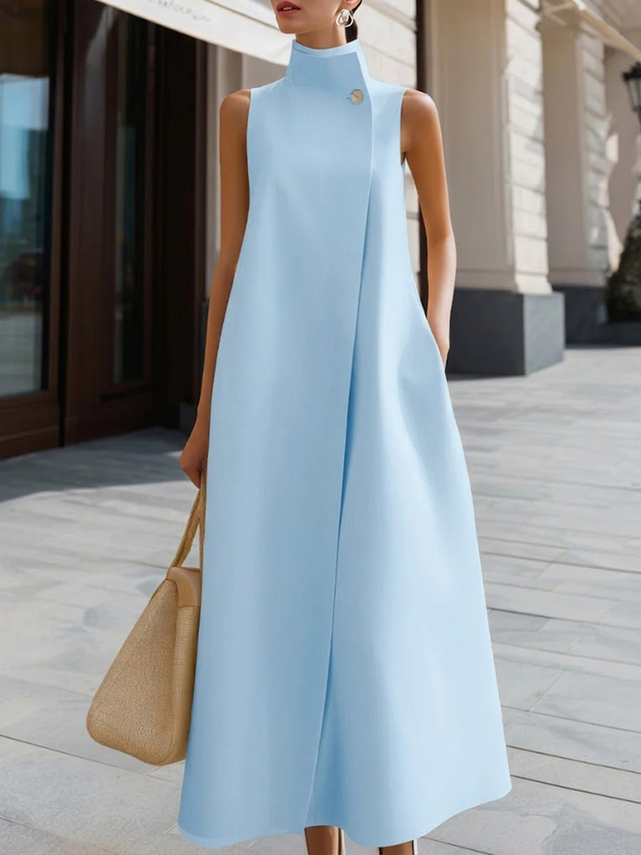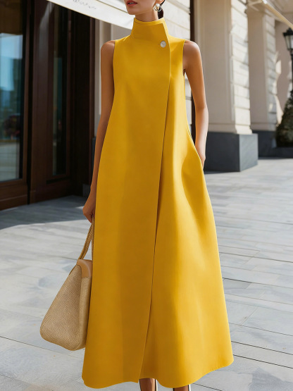 Women's Solid Color Stand Collar Sleeveless Casual Loose Cotton Linen Dress