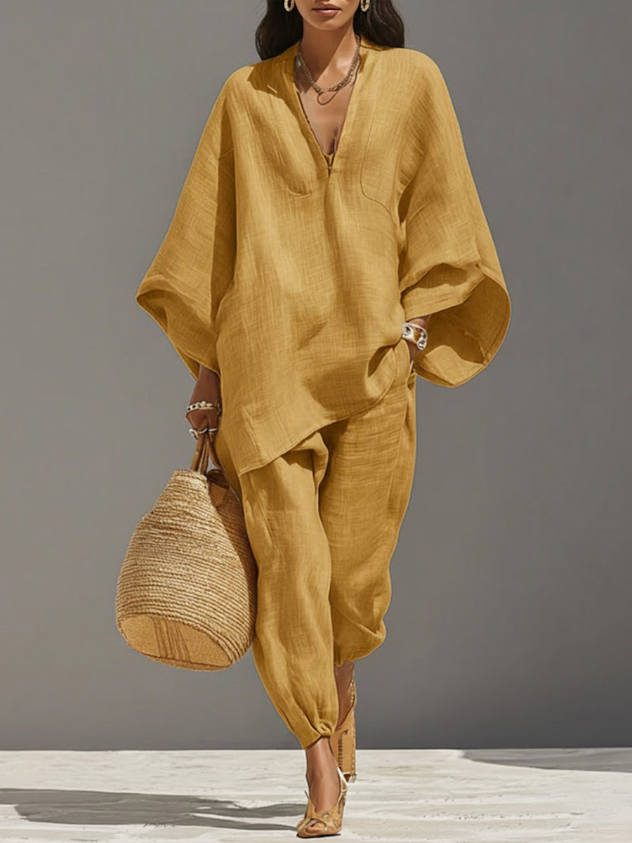 Women's Solid Color V-neck Long Sleeve Casual Loose Cotton Linen Top With Elastic Waist And Wide-leg Pants Set