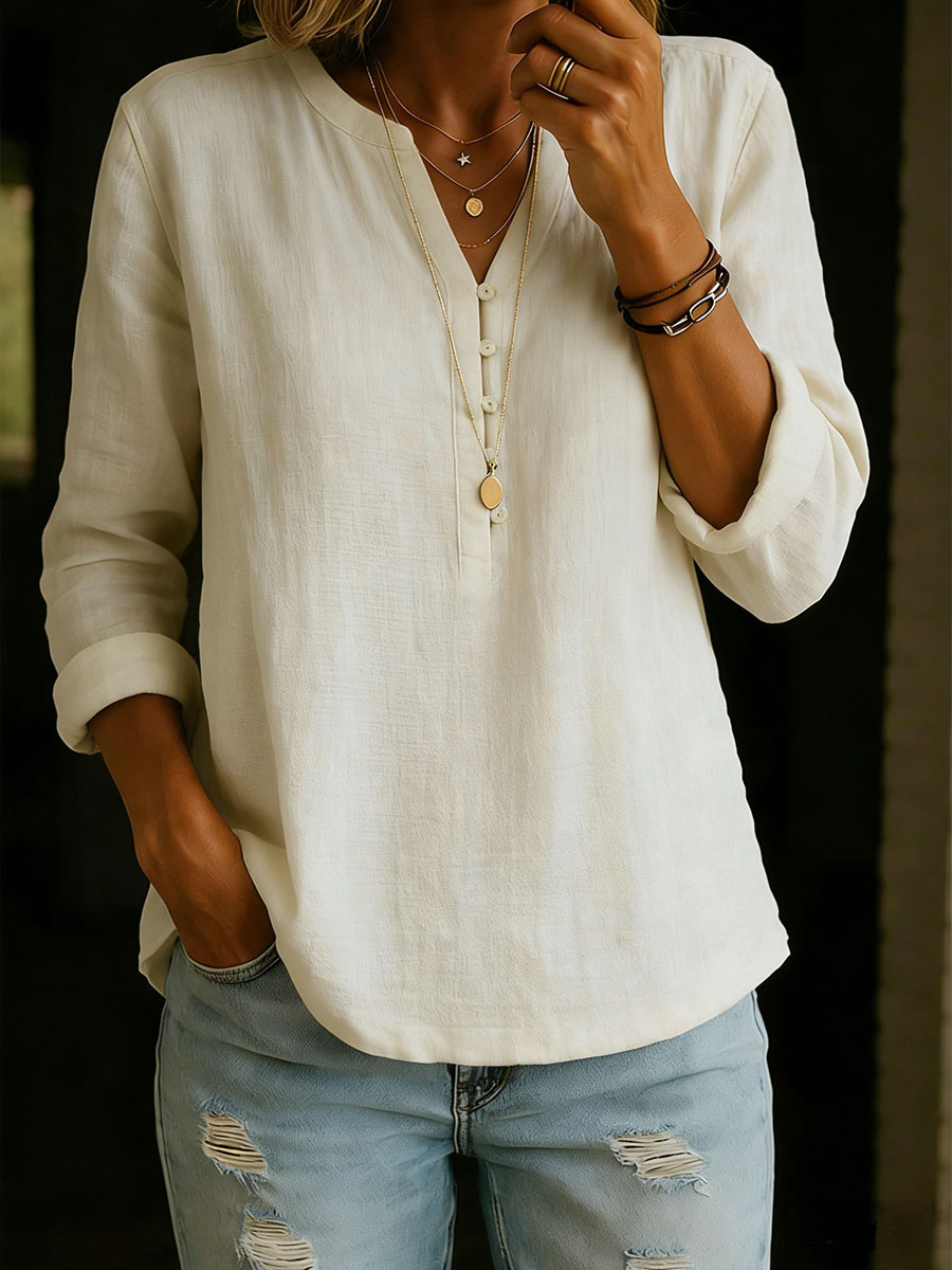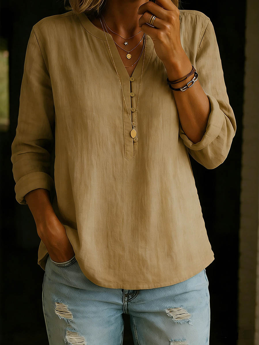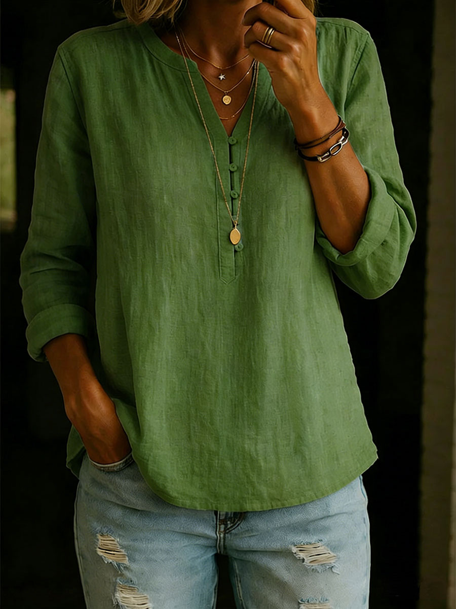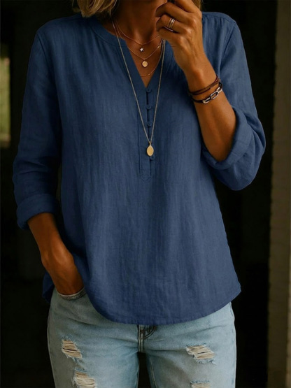 Women's Solid Color V-neck Long-sleeved Casual Loose Cotton And Linen Top