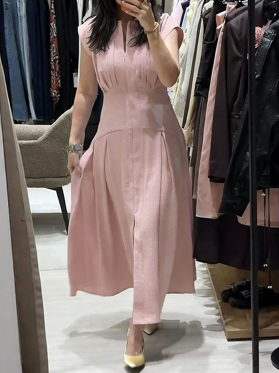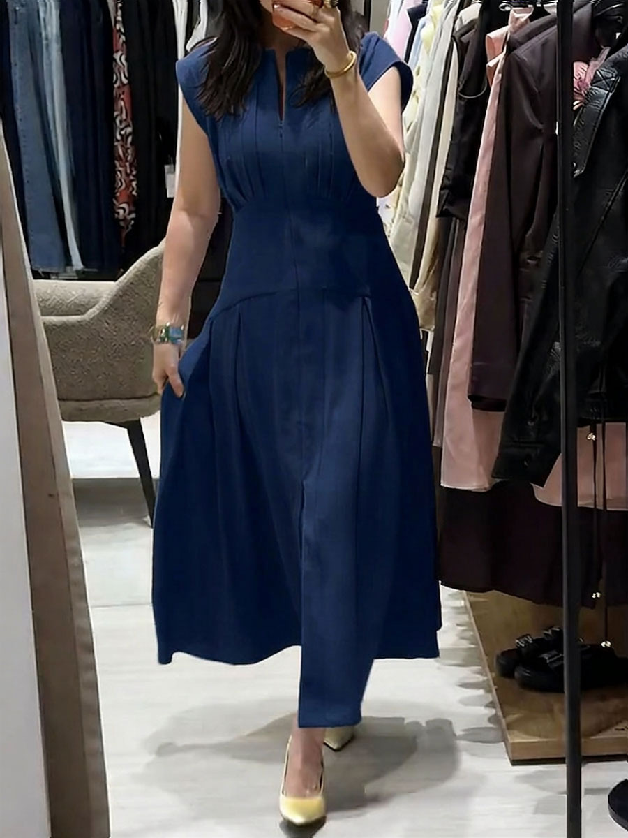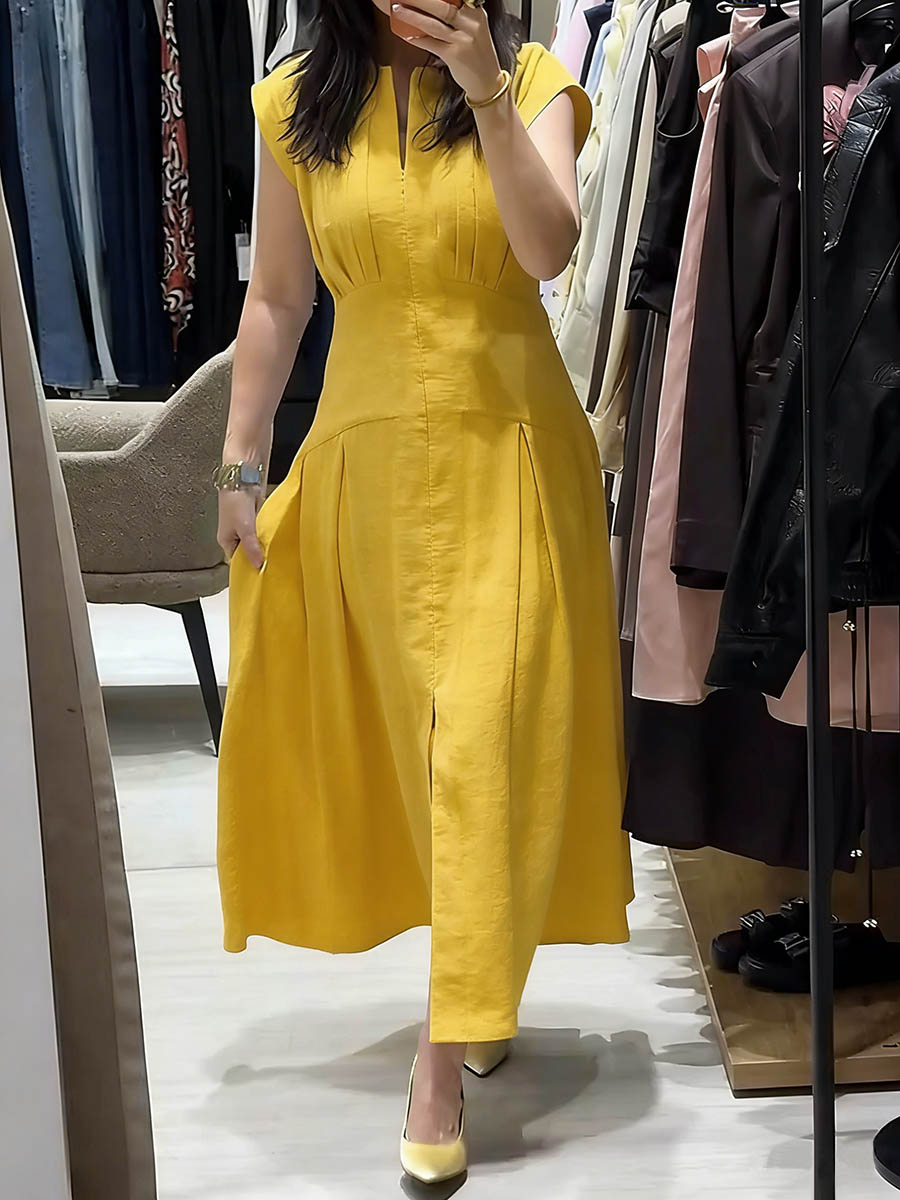Women's Solid-color V-neck Sleeveless Casual Loose Cotton-linen Dress