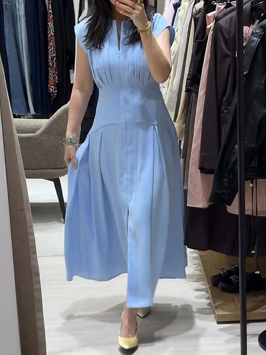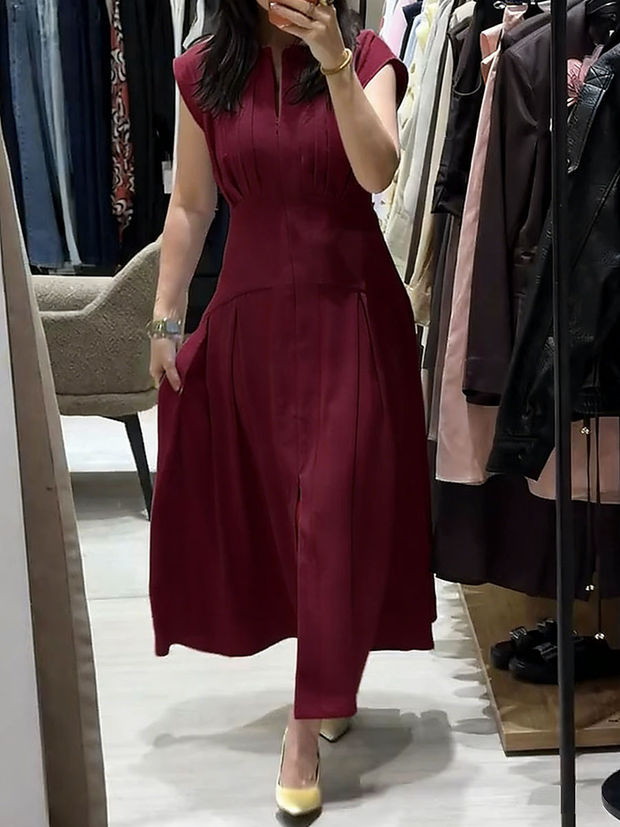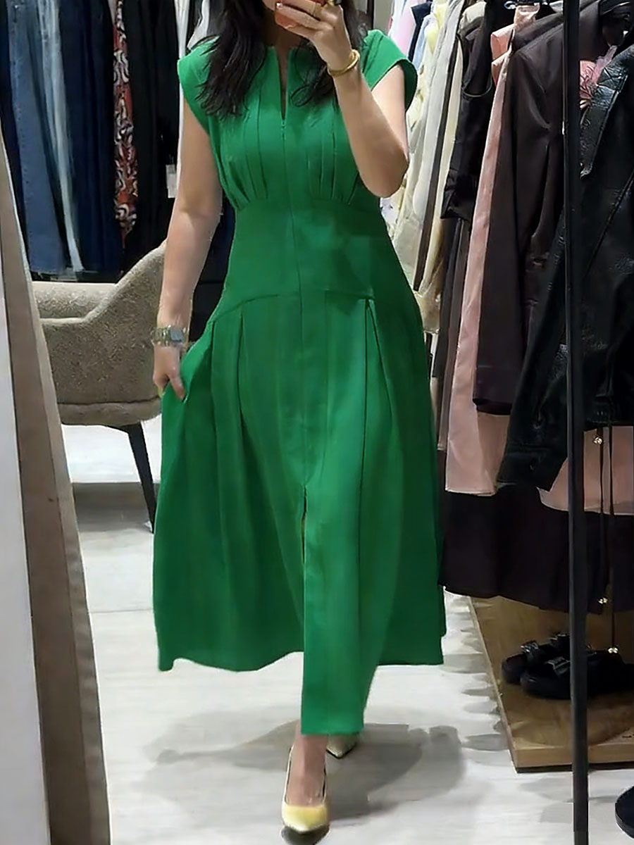 Women's Solid-color V-neck Sleeveless Casual Loose Cotton-linen Dress