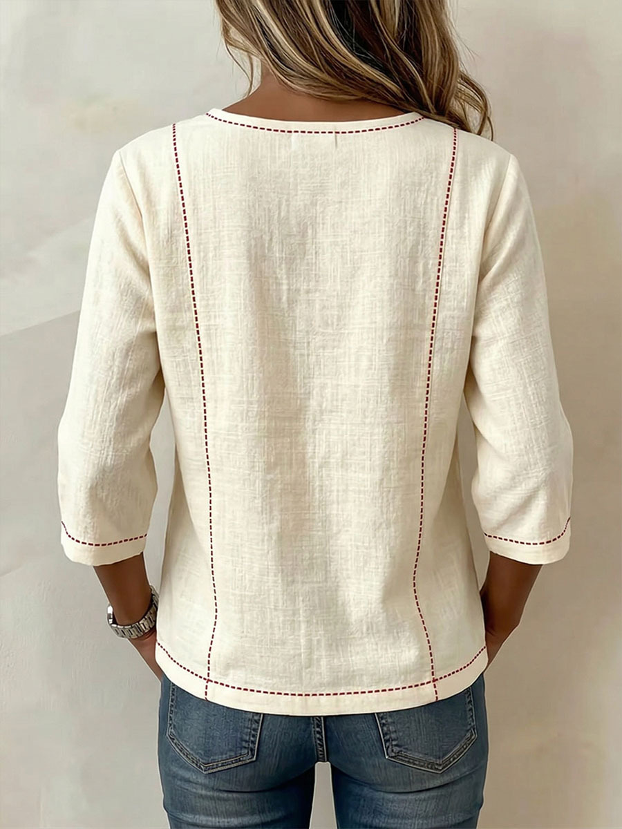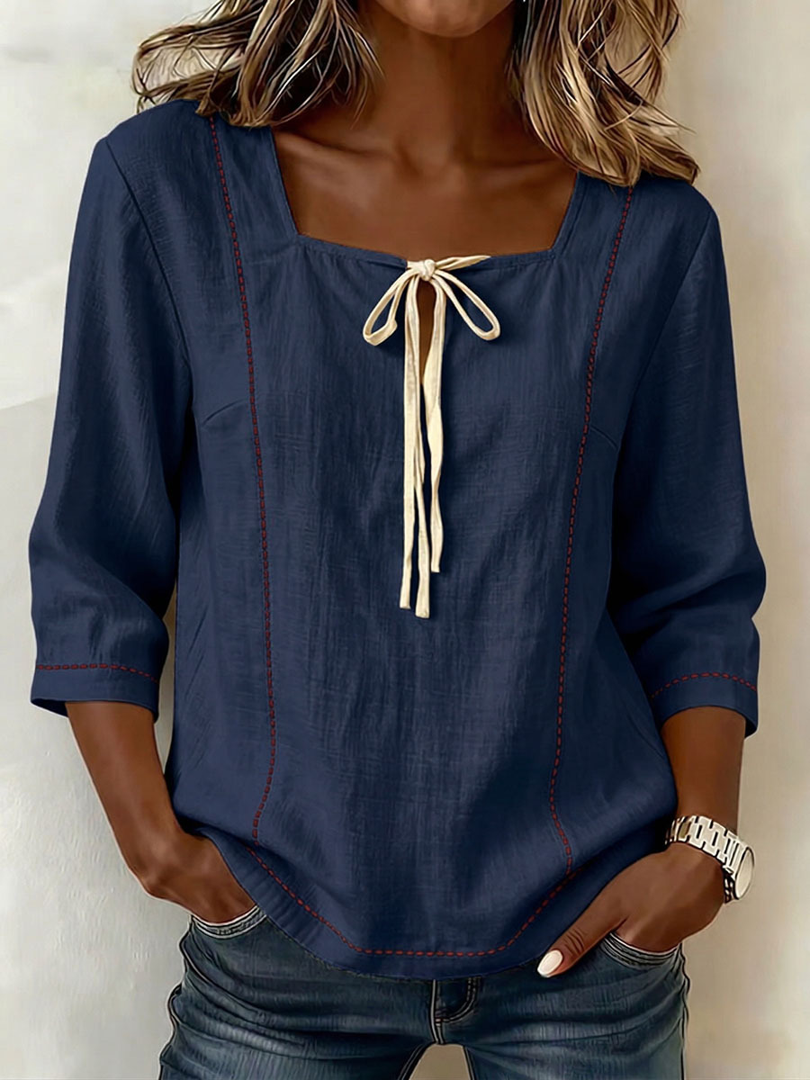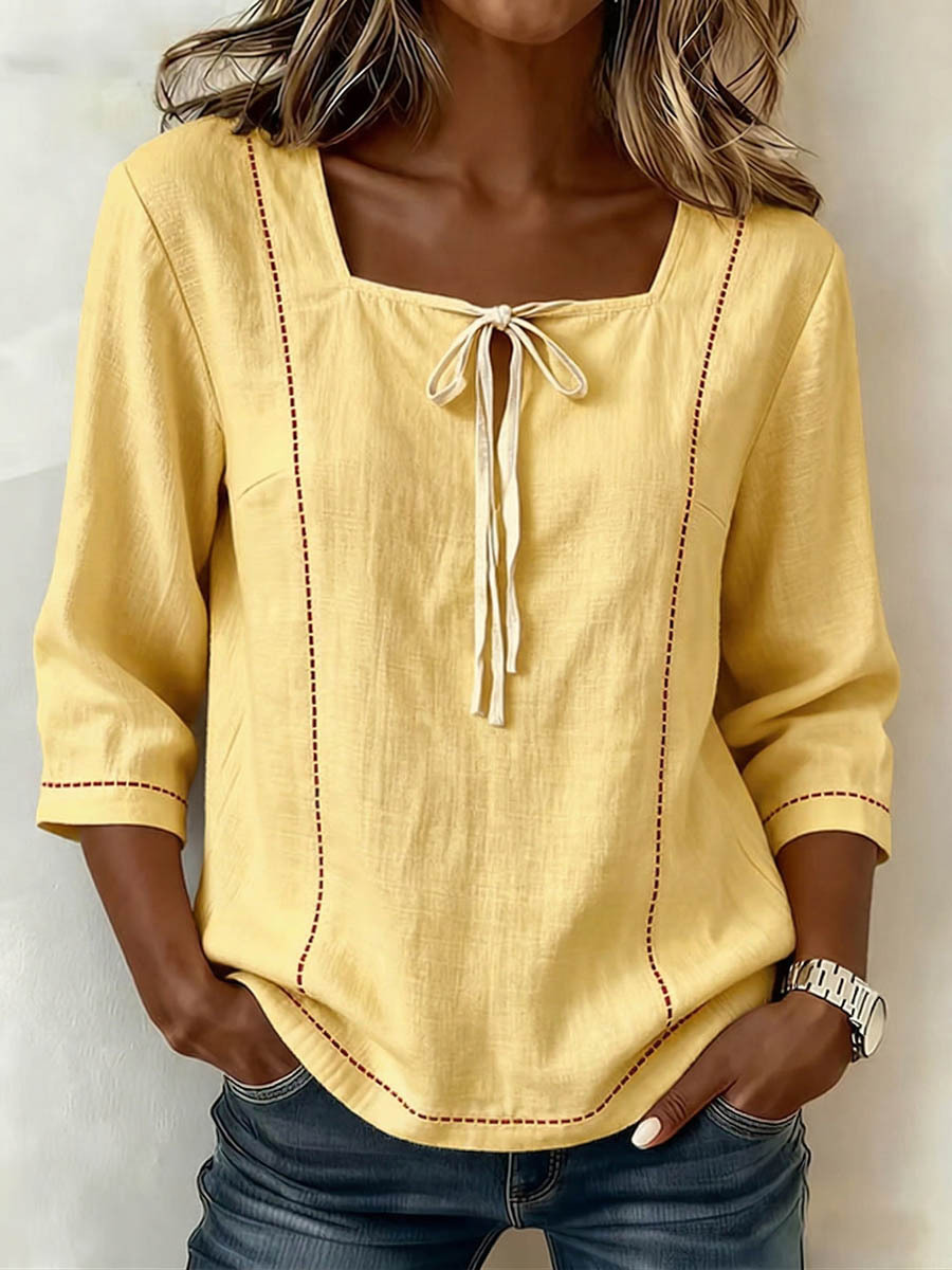 Women's Square-neck 3/4-sleeve Loose-fit Cotton-linen Top