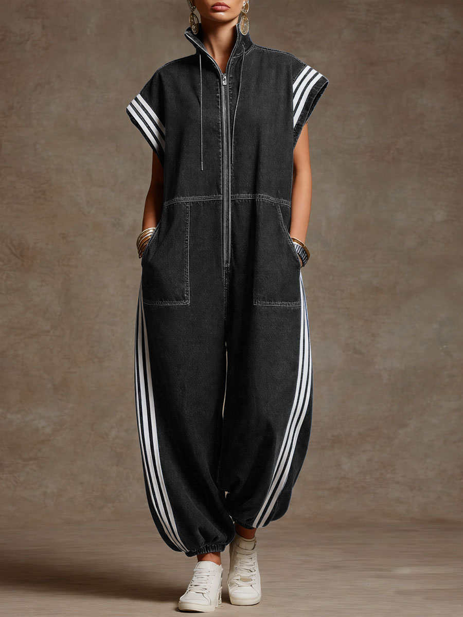 Women's Stand-collar Short-sleeved Casual Loose Denim Wide-leg Jumpsuit